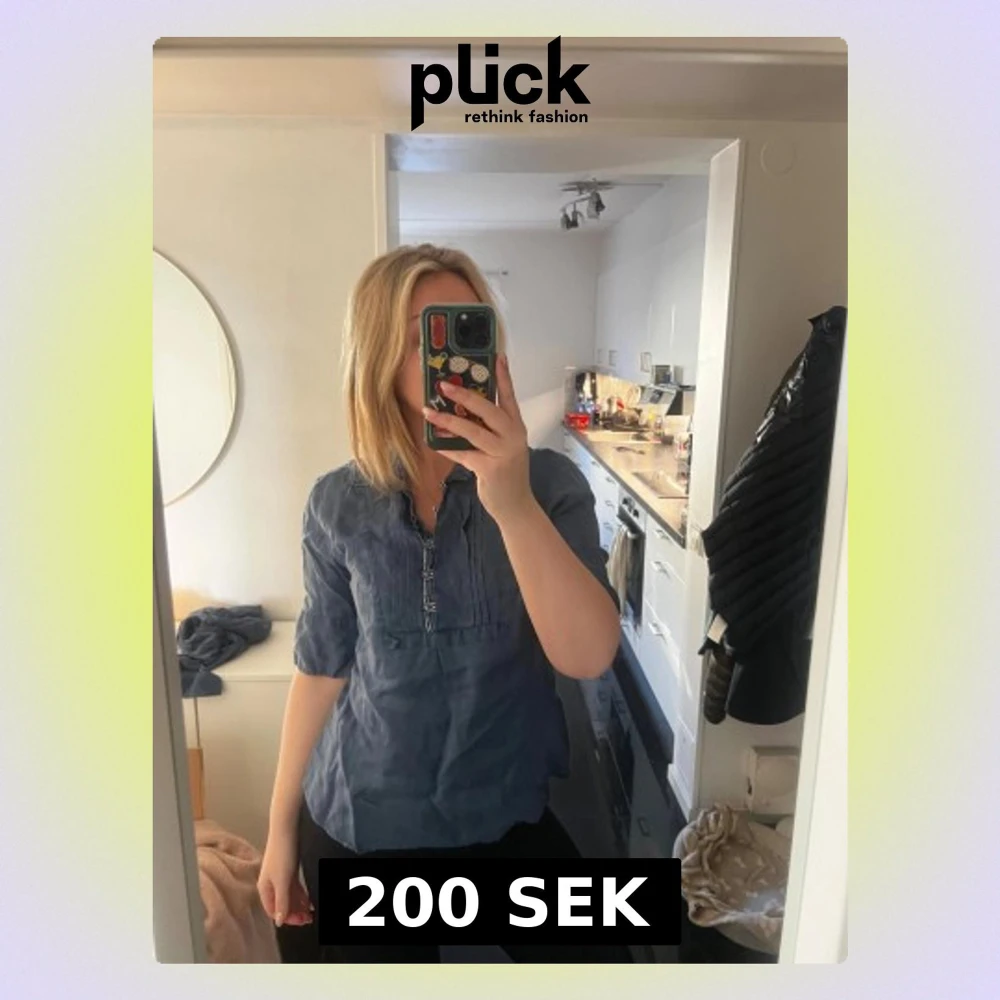 Säljer en mörkblå blus med halvknäppning och dekorativa veck framtill. Blusen har korta ärmar och en avslappnad passform. Materialet känns lätt och luftigt, perfekt för dig som gillar stilrena och enkla plagg med en twist.