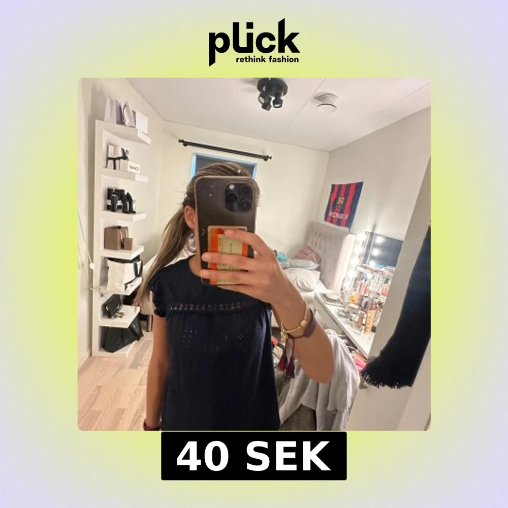 Säljer en mörkblå blus med fina spetsdetaljer och små hålmönster framtill. Blusen har korta ärmar med volang och en avslappnad passform. Perfekt för dig som gillar en söt och stilren look.