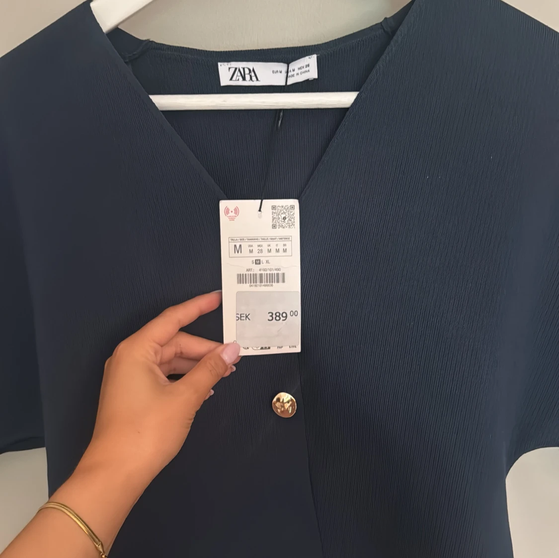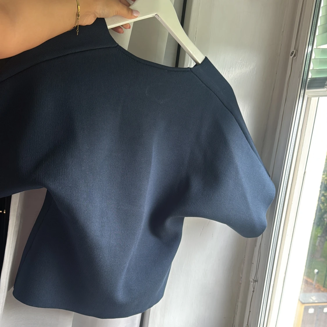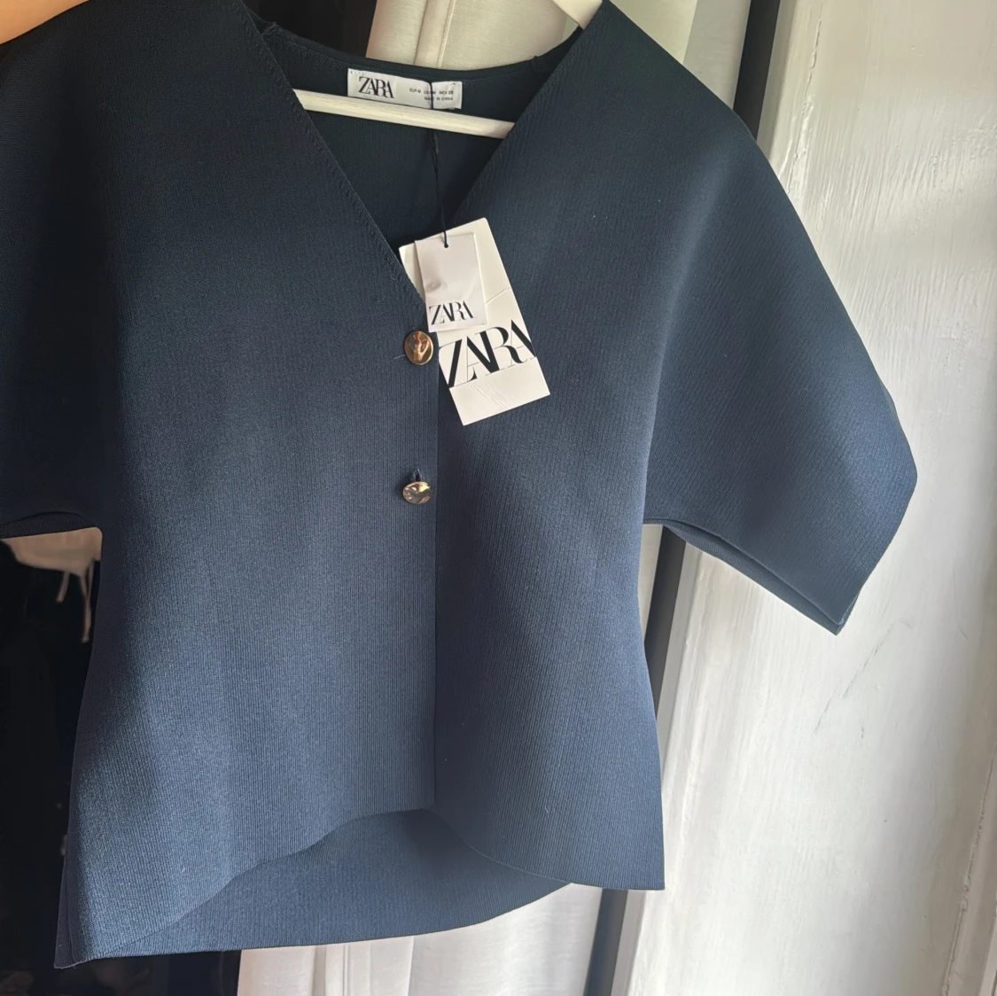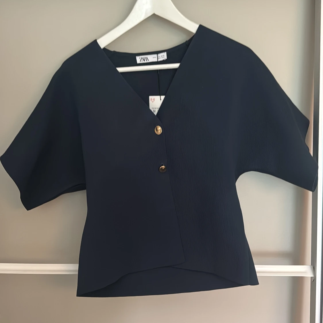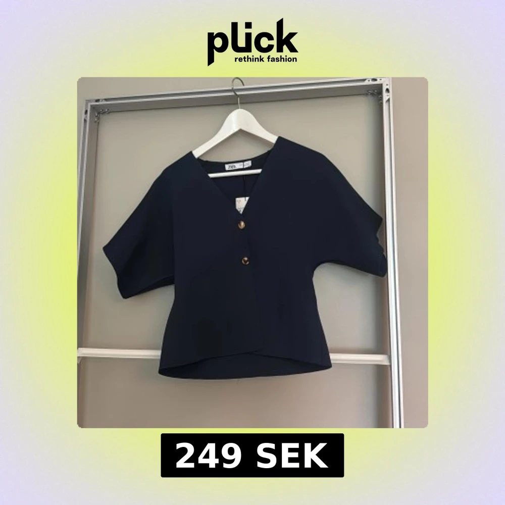 Snygg mörkblå blus från Zara med v-ringning och två guldiga knappar framtill. Modellen är boxig med korta, vida ärmar och lätt strukturerat tyg. Perfekt för dig som gillar stilrena och moderna plagg med en twist. Aldrig använd!