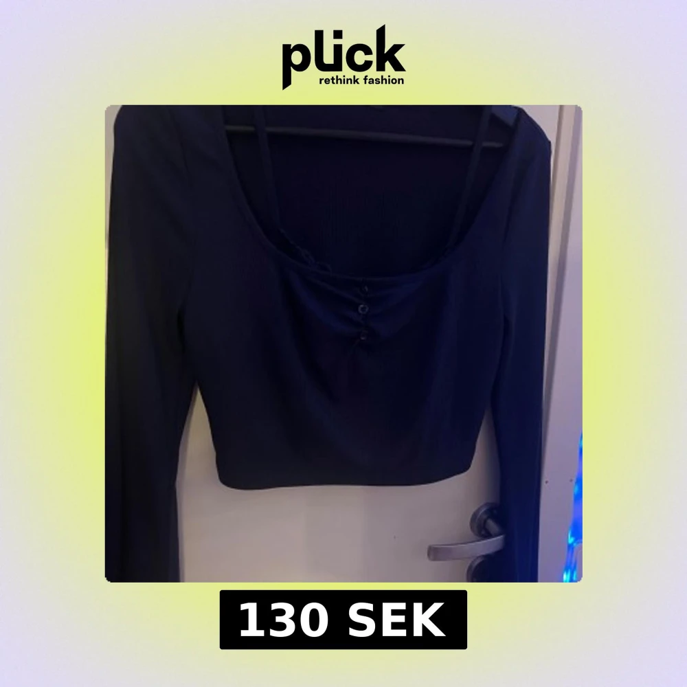 Säljer en mörkblå croppad topp med långa ärmar och ribbad struktur. Toppen har en snygg, djup rundad urringning framtill och tre små knappar som detalj. Perfekt att styla med höga jeans eller kjol för en trendig look.