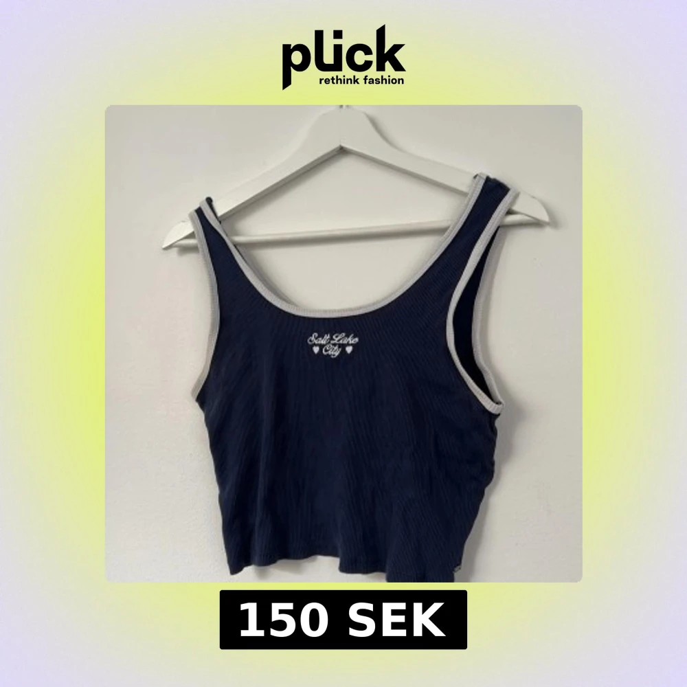 Croppad mörkblå linnetopp från Pull&Bear med ribbad struktur och ljusgrå kantband. Tryck med texten 'Salt Lake City' och små hjärtan framtill. Perfekt för en chill och sportig look.