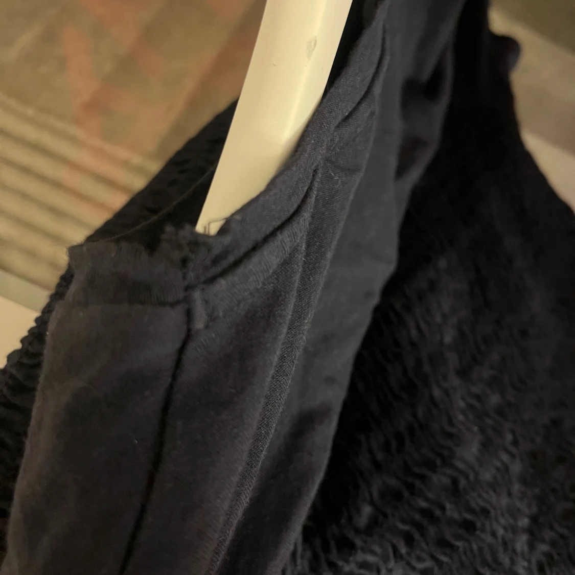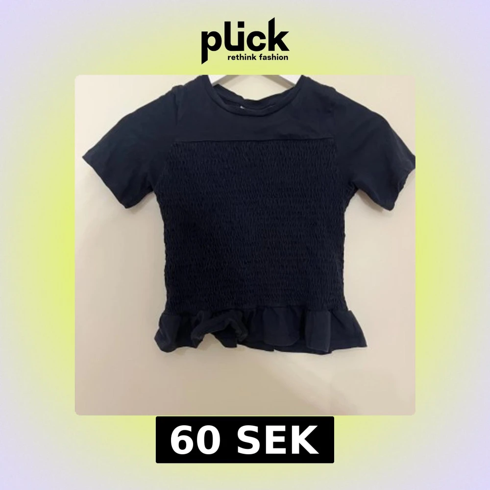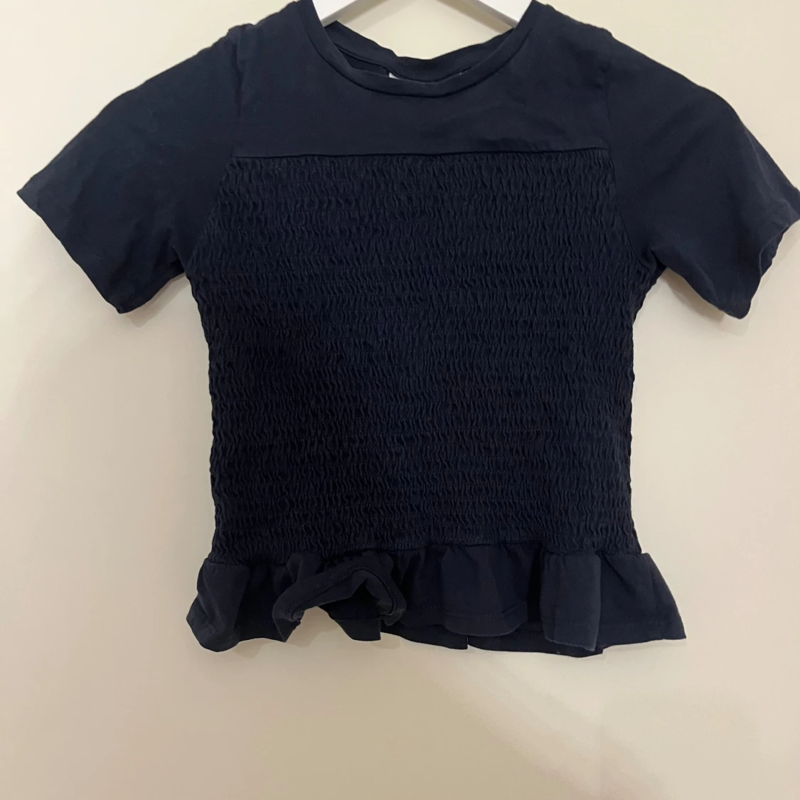 Mörkblå topp från Gina Tricot med korta ärmar och smockad front. Toppen har en söt volangkant nedtill som ger en extra detalj. Tillverkad i mjukt bomullsmaterial och har en enkel, stilren look som passar till mycket. Har liten defekt (se bild) men syns ej när man har på sig eftersom håret brukar täcka. Storlek 134/140 men passar mig som kan ha xxs och xs.