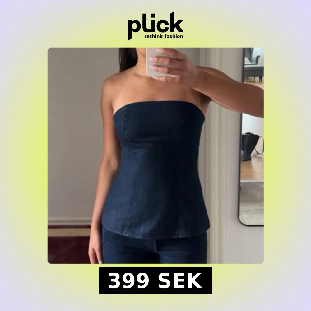Säljer en stilren mörkblå bandeau topp i jeansmaterial. Toppen är axelbandslös och har en figurnära passform som ger en clean och modern look. Perfekt att matcha med både jeans och vida byxor för en cool denim-on-denim vibe.