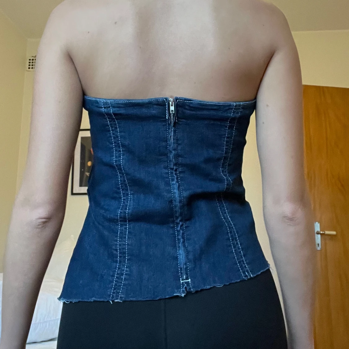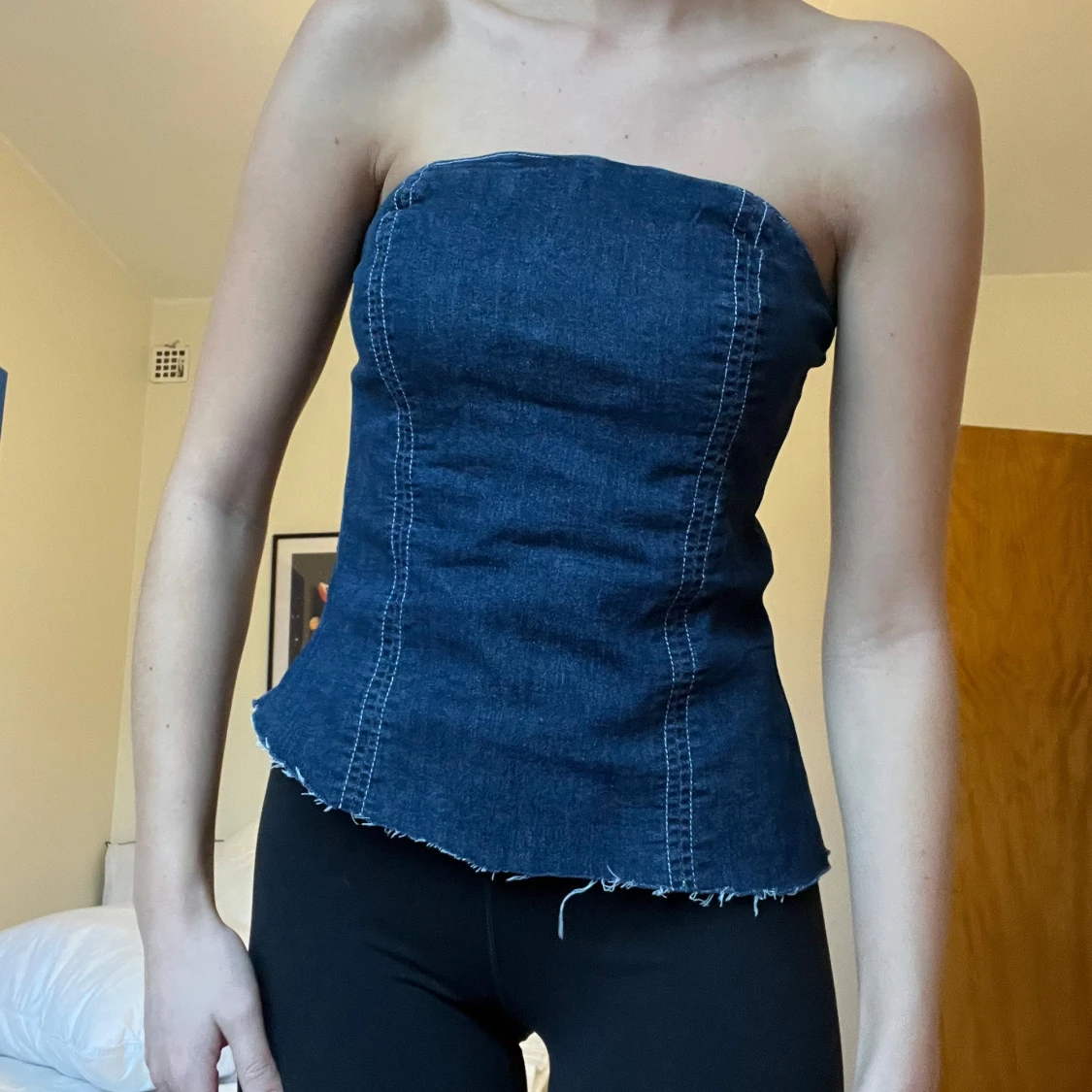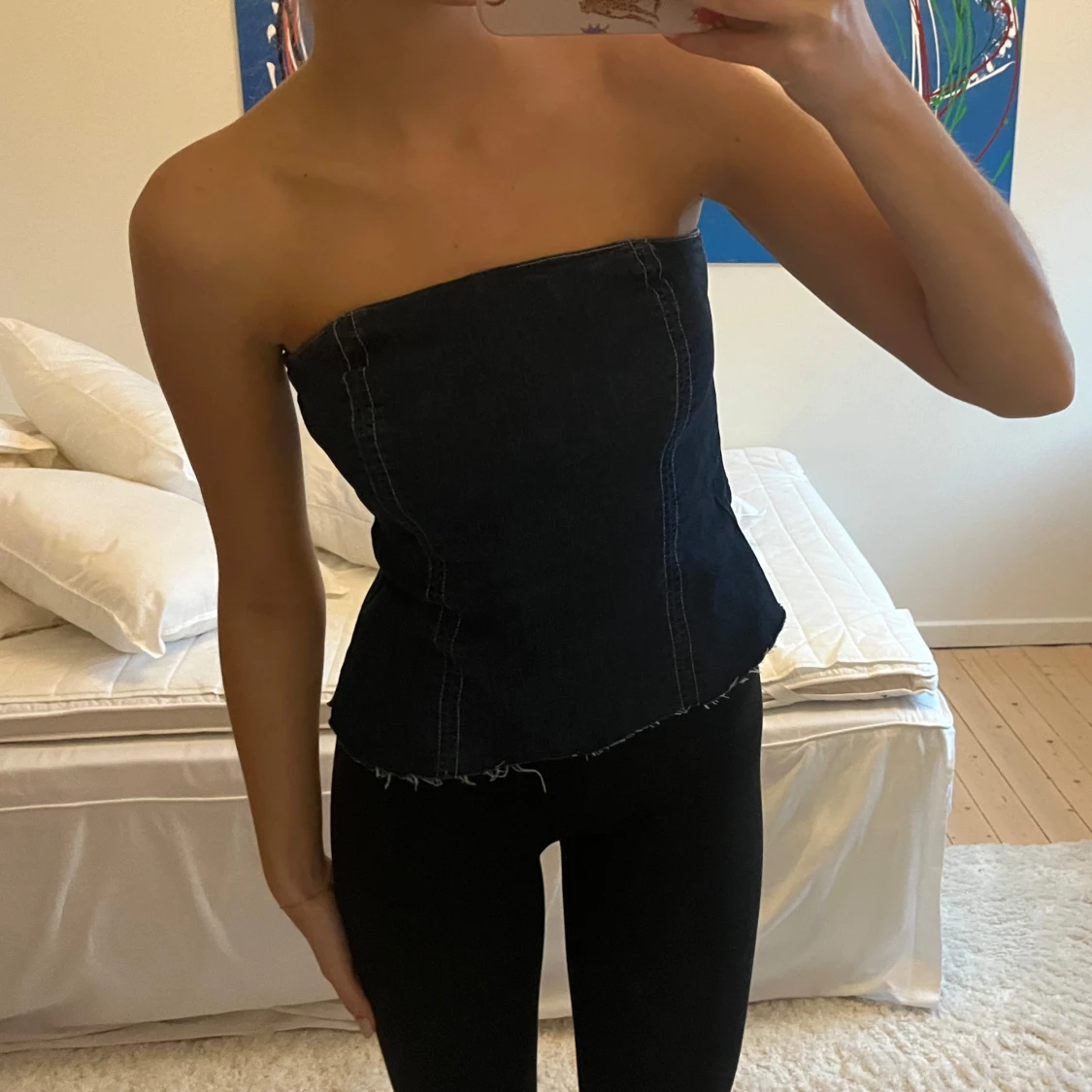 Snygg mörkblå tubtopp i jeansmaterial med råa kanter och dragkedja bak. Perfekt för en trendig look. Helt handsydd så finns ingen likadan. 🩵🩵🩵🧿🧿🧿🧿 BUDA. Passar S och M