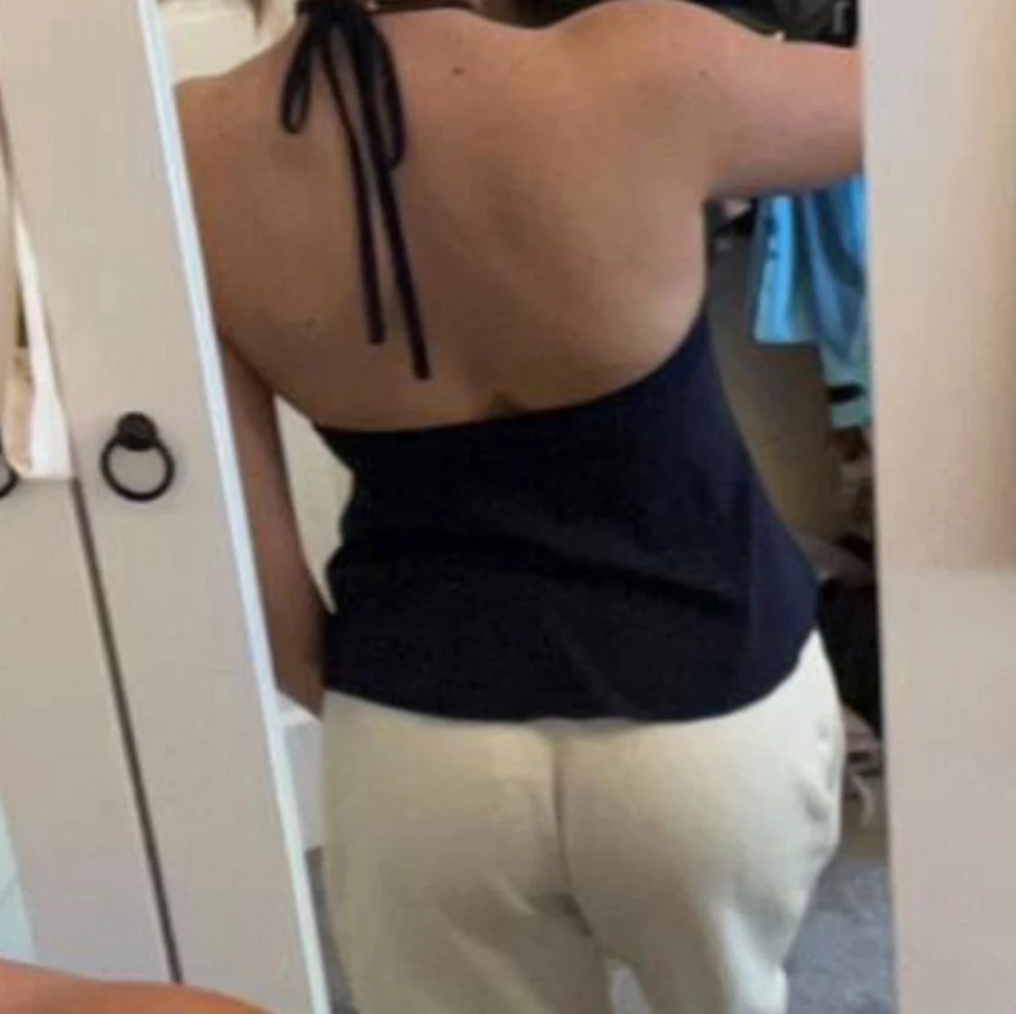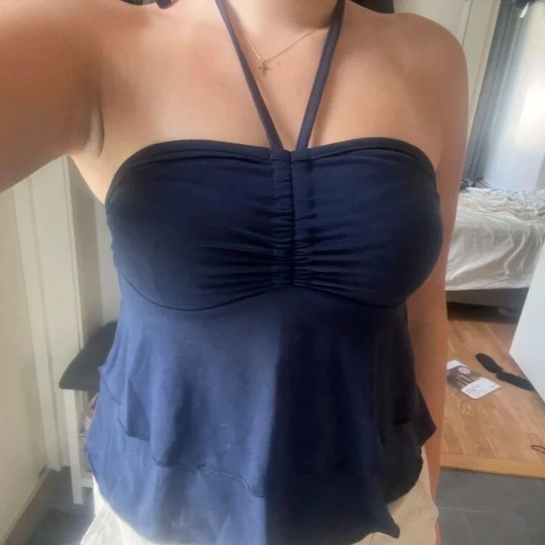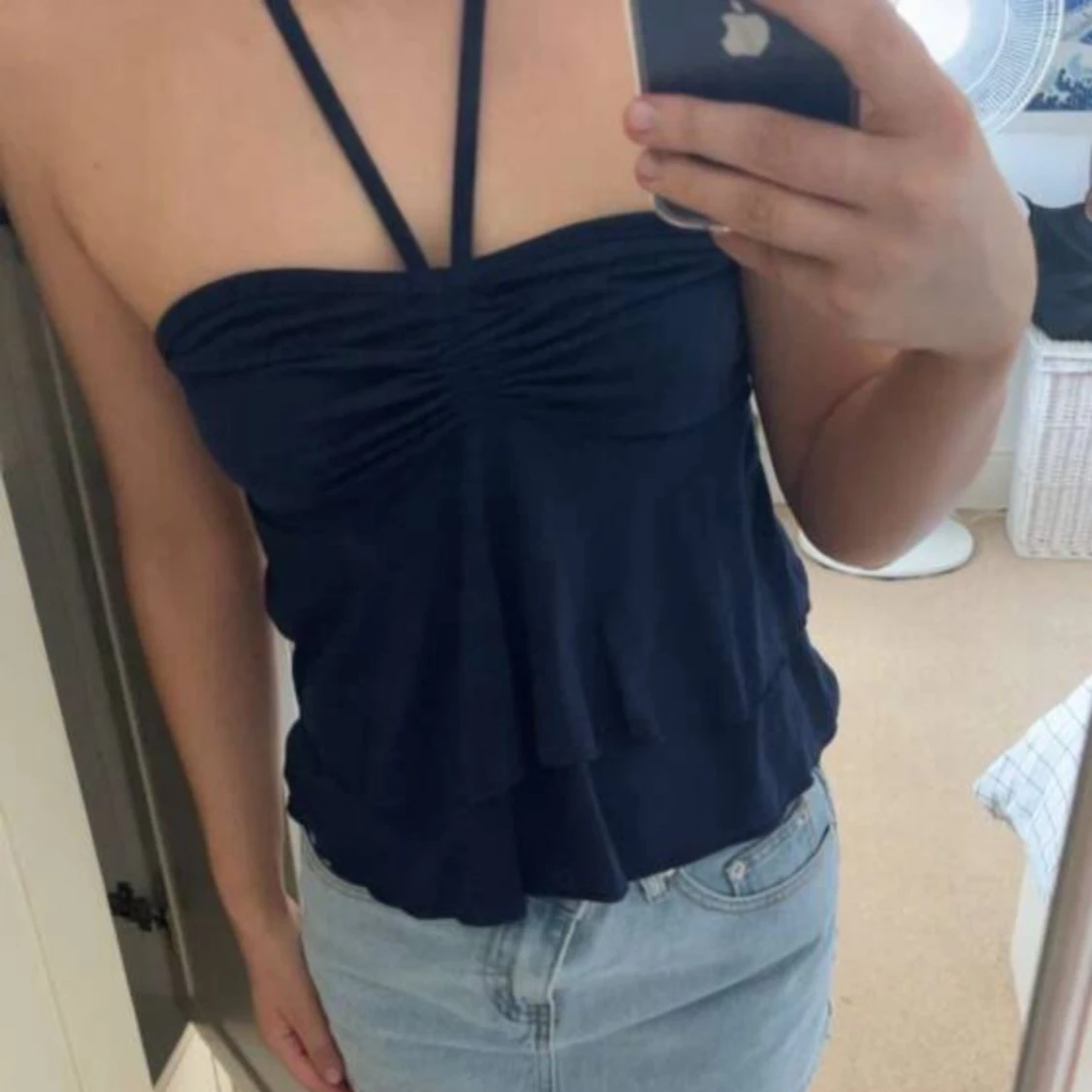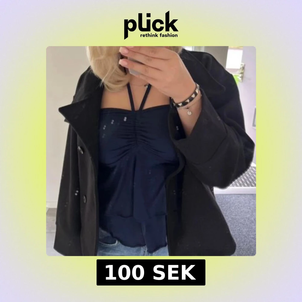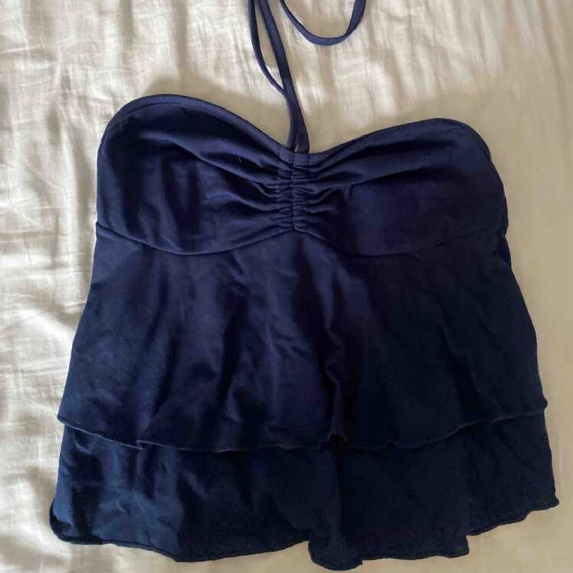 Säljer en mörkblå linnetopp med halterneck/knytband och snygg rynkning framtill. Toppen har volangdetaljer och öppen rygg med knyt i nacken. Storlek XS/S (lappen e bortklippt)