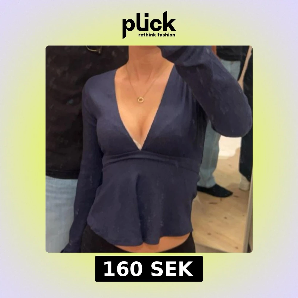 Säljer en mörkblå långärmad blus med djup v-ringning och lätt utsvängd nederdel. Perfekt för dig som gillar stilrena och feminina toppar.