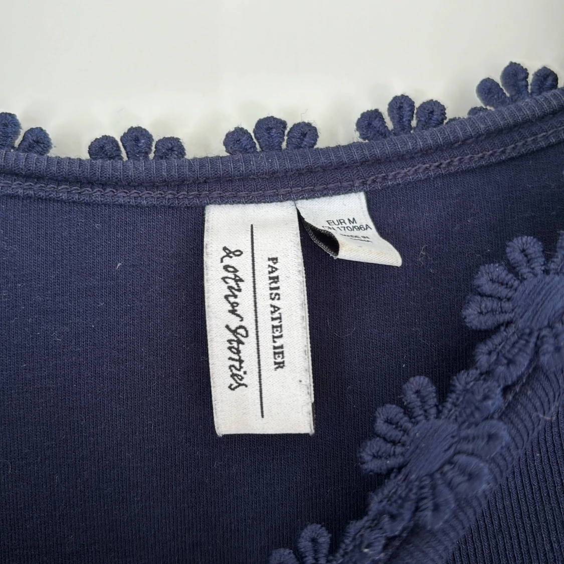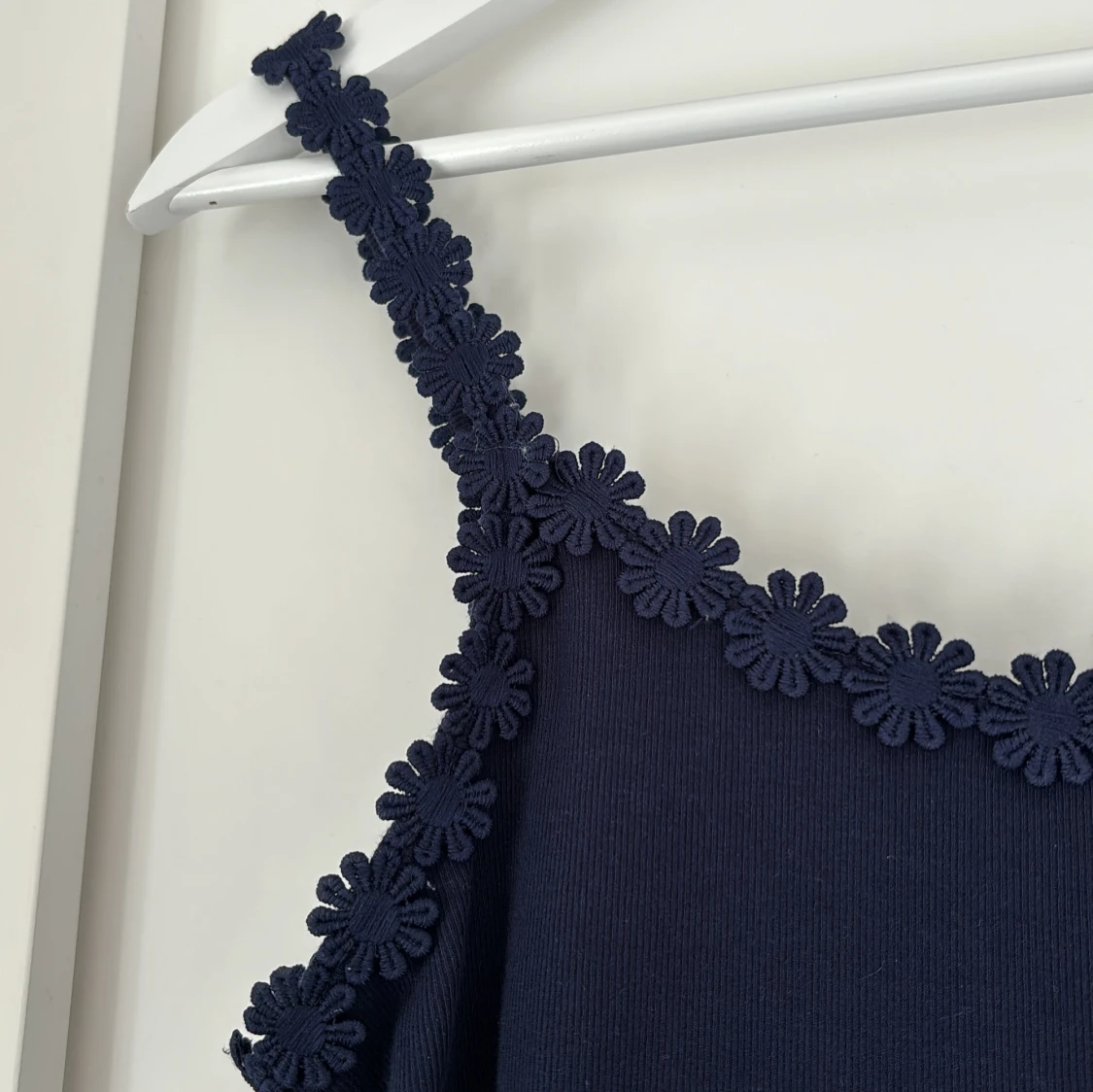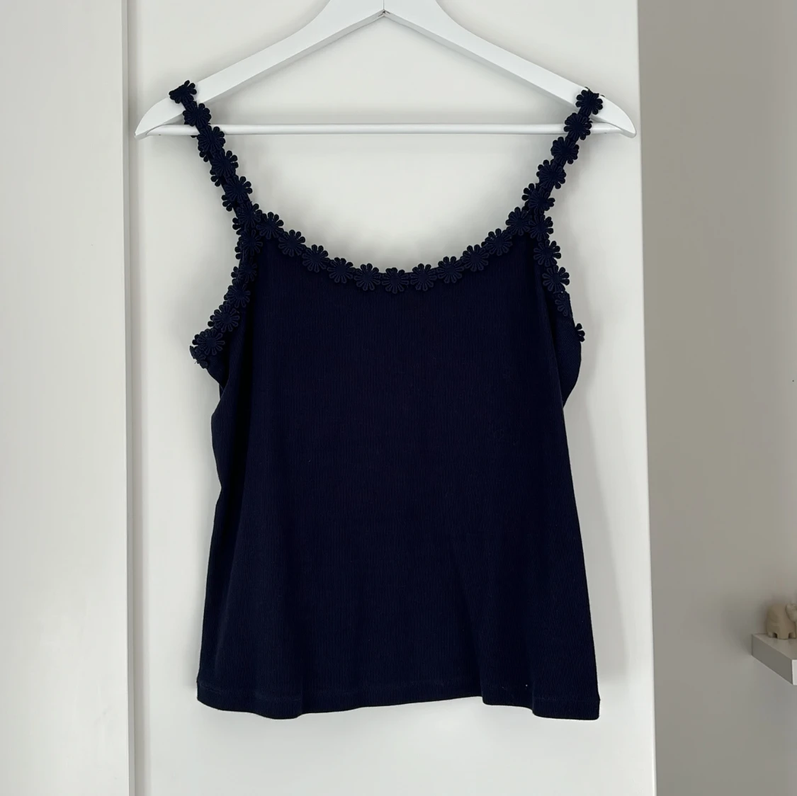 Säljer en mörkblå linnetopp från & Other Stories med fina blommiga detaljer längs axelbanden. Perfekt för en stilren och somrig look. Toppen är ärmlös och har en mjuk och bekväm passform.