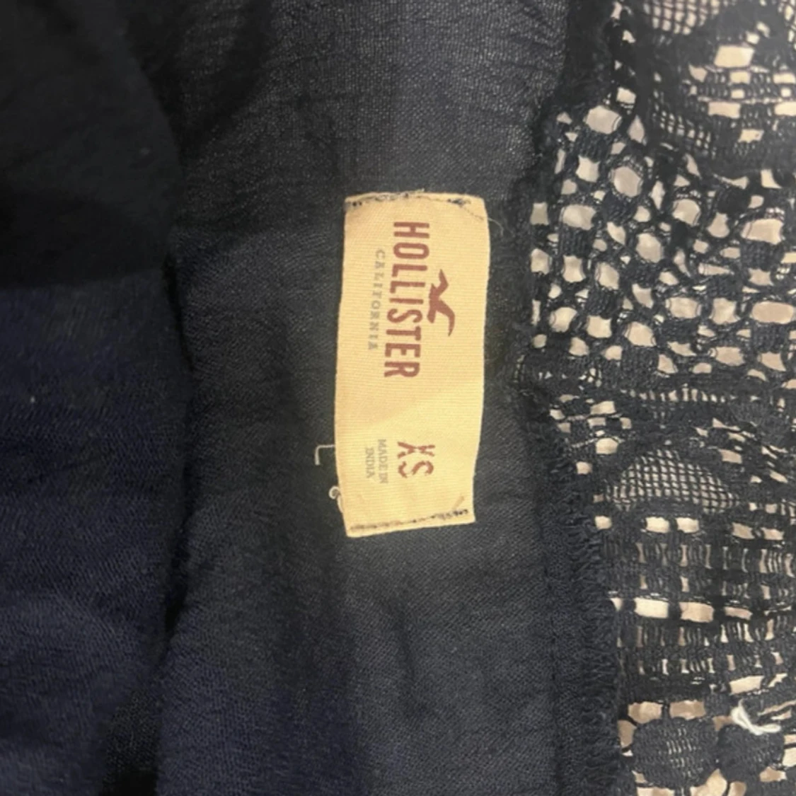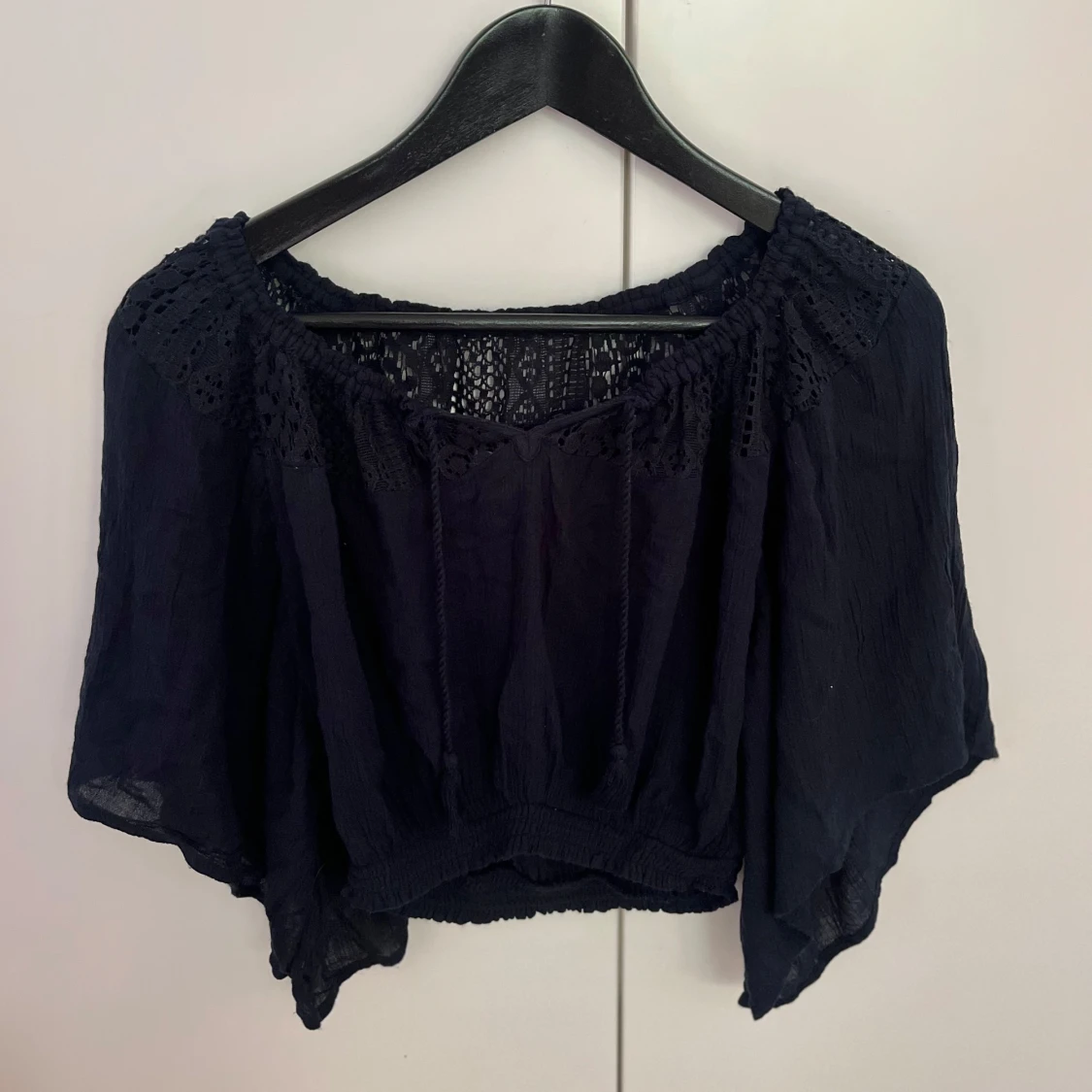 Superfin mörkblå spetsblus från Hollister i offshoulder-modell. Blusen är croppad och har virkade spetsdetaljer upptill. Perfekt till sommaren!