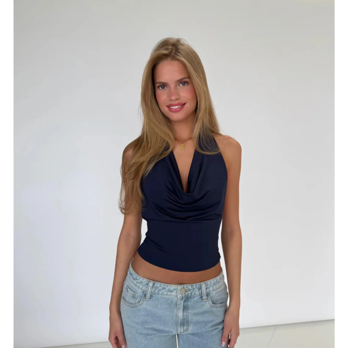 Snygg mörkblå omlott linnetopp med draperad halsringning och ärmlös design. Toppen har en tight passform och är perfekt att matcha med jeans eller kjol. Materialet känns mjukt och följsamt mot huden.