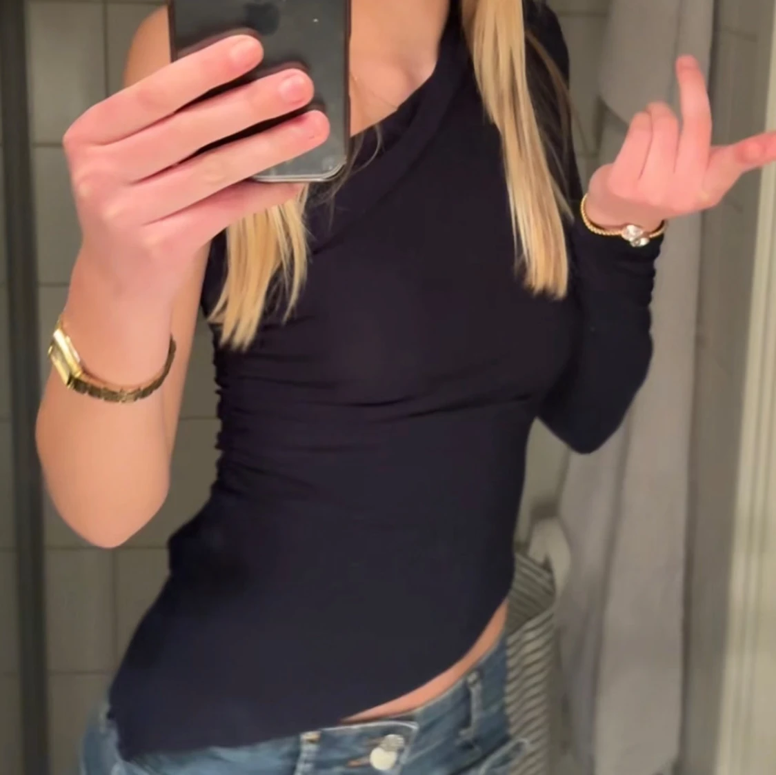 Snygg mörkblå oneshoulder topp med lång ärm på ena sidan och axeln bar på andra. Tight passform som framhäver figuren, perfekt till jeans eller kjol. Enkel och stilren design som passar till många olika looks.