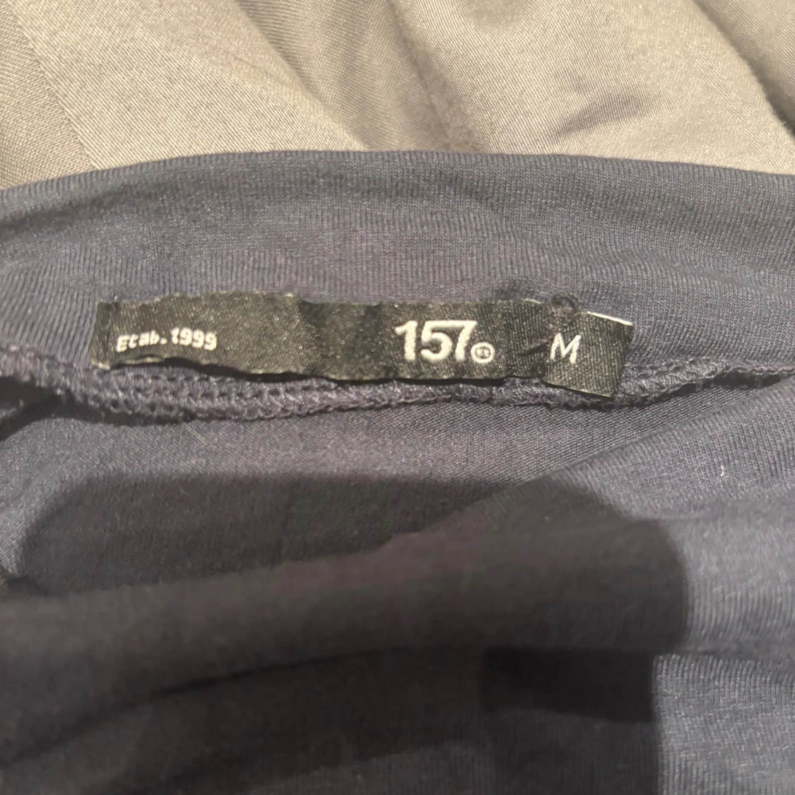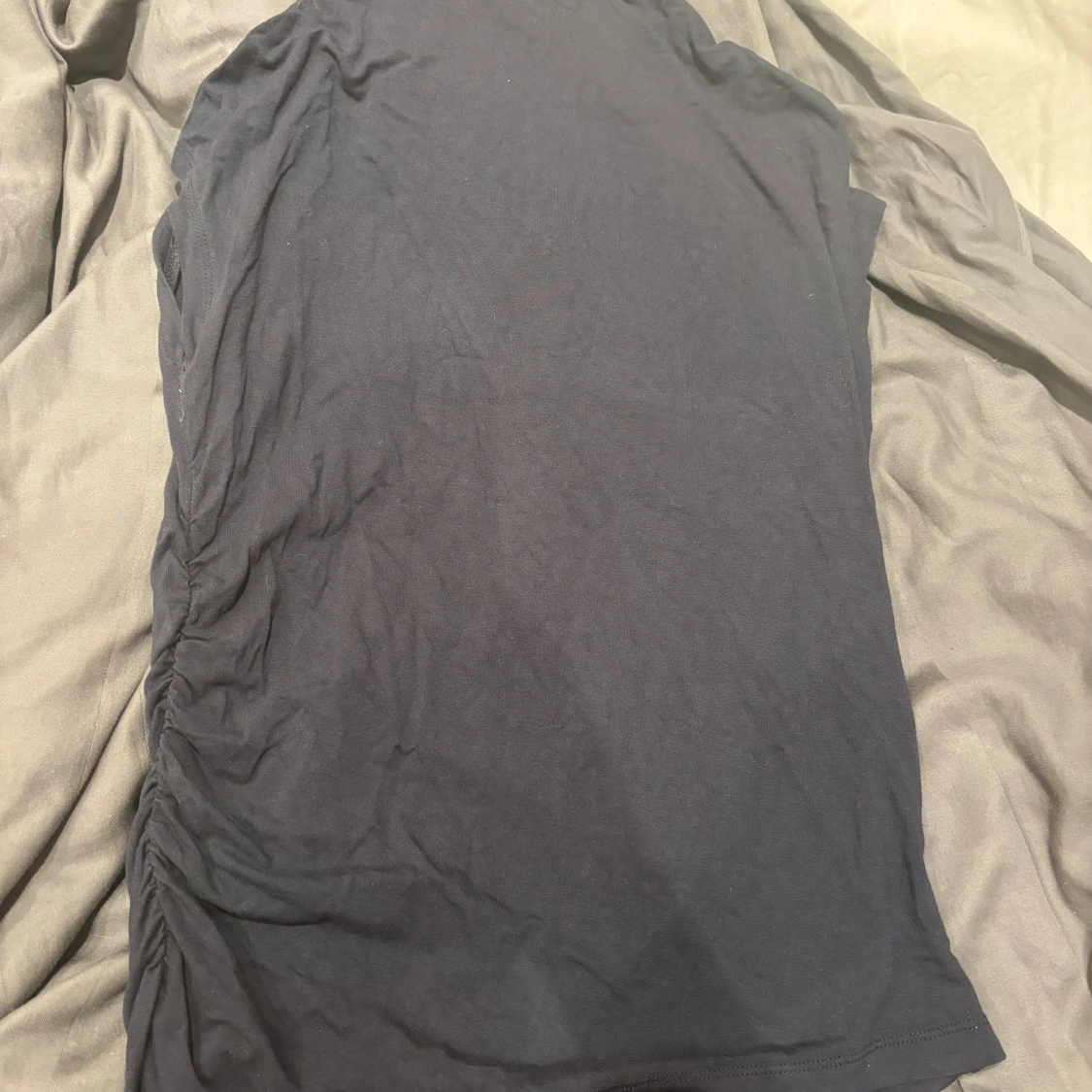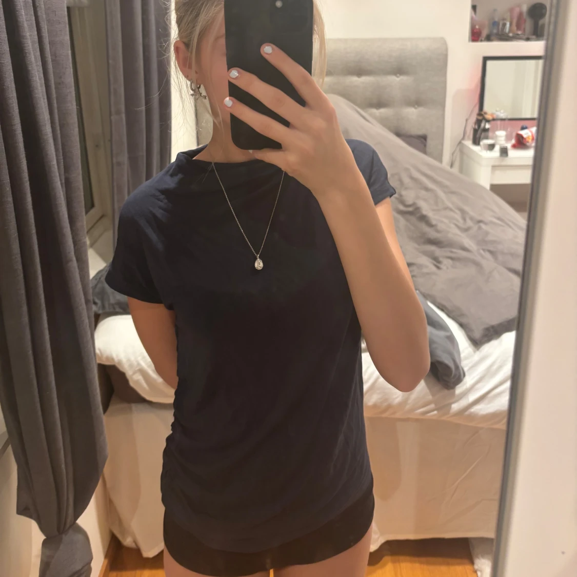 Säljer en mörkblå polotopp från 157 i mjuk bomull. Toppen har korta ärmar och en högre hals, med snygg snörning på ena sidan för extra stil. Perfekt att matcha med jeans eller kjol för en clean look.