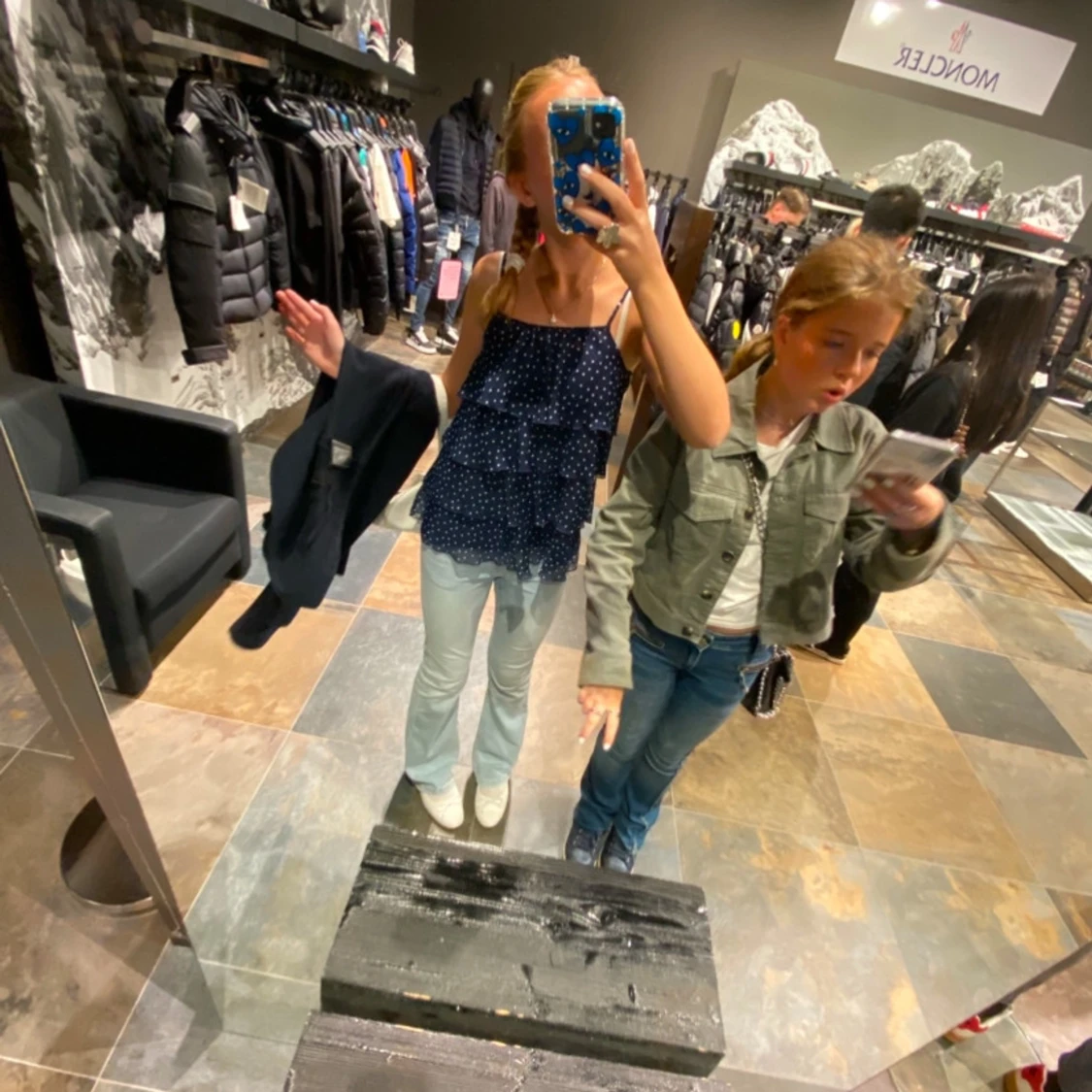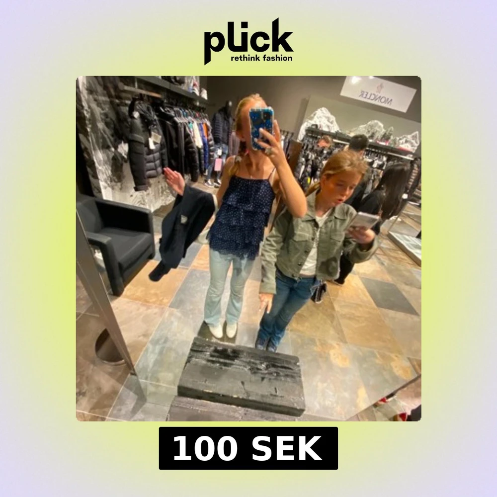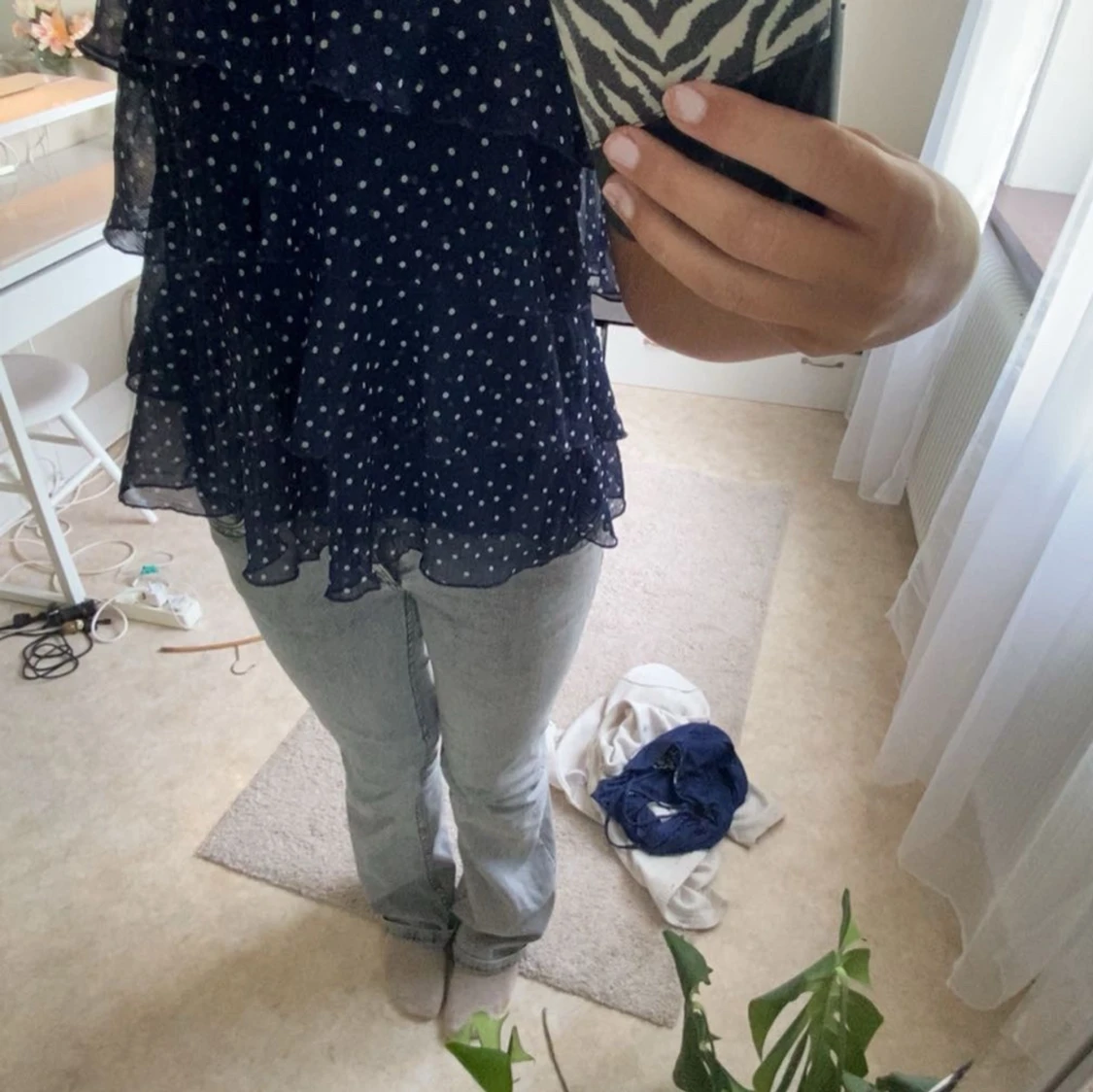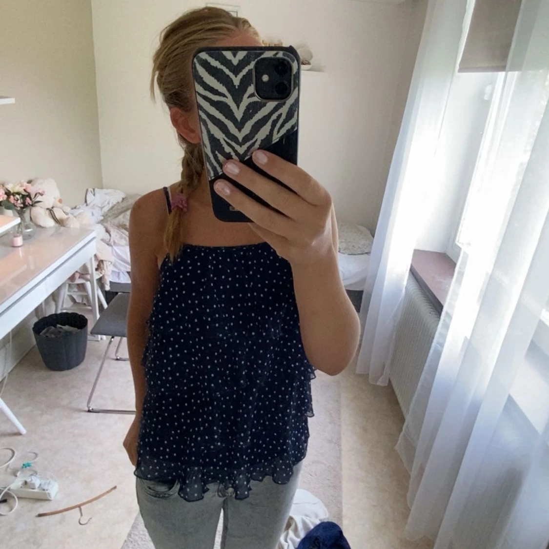 Säljer en mörkblå ärmlös linne-topp med vita prickar och flera volanglager. Från H.M. Pris kan diskuteras 💞