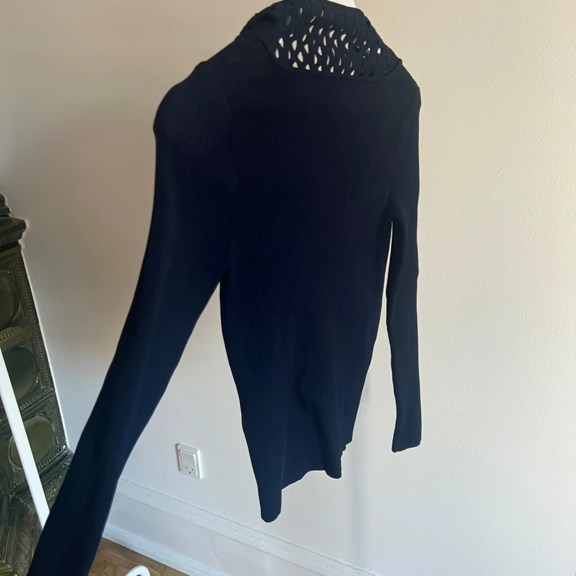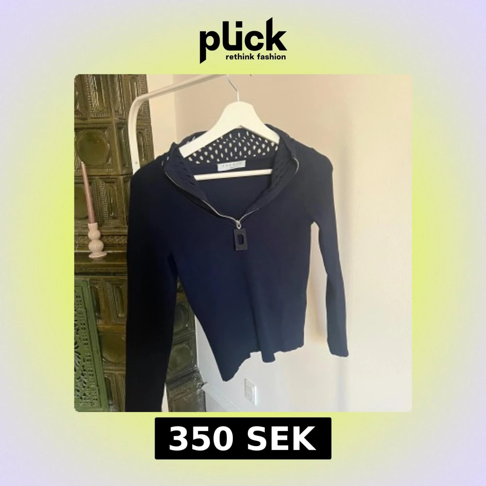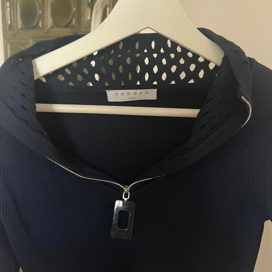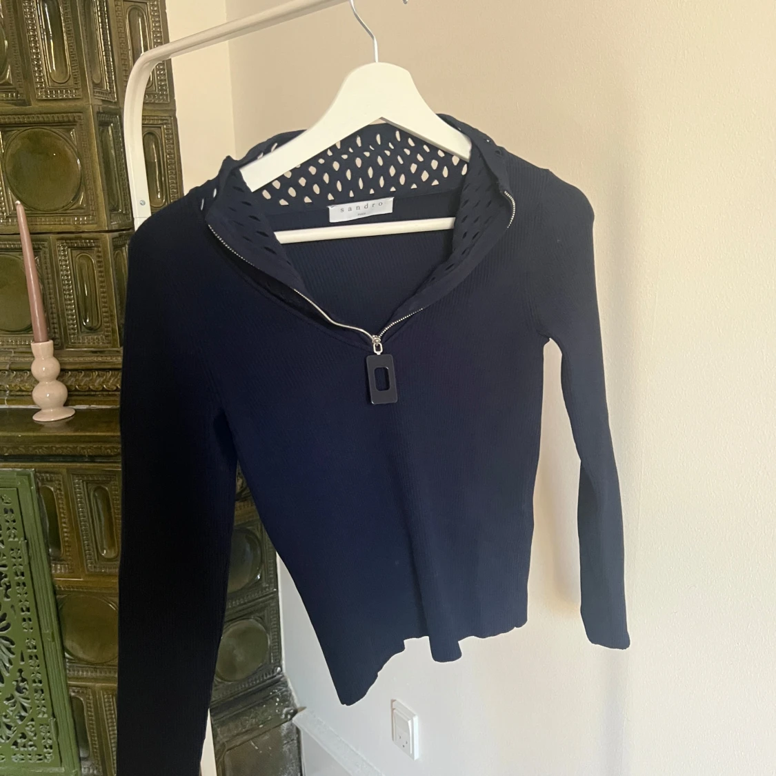 Säljer en mörkblå ribbad topp från Sandro med dragkedja framtill! Tröjan har lång ärm och en snygg, figurnära passform. 😍