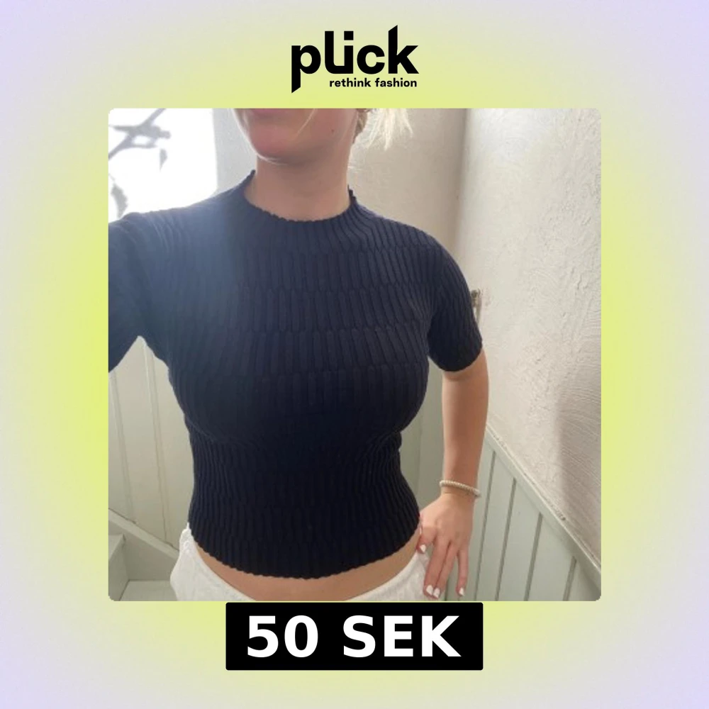 Säljer en mörkblå ribbad topp med lite längre ärmar. Lite högre krage och ribbade materialet gör tröjan unik. Priset går att diskutera 💕⚡️