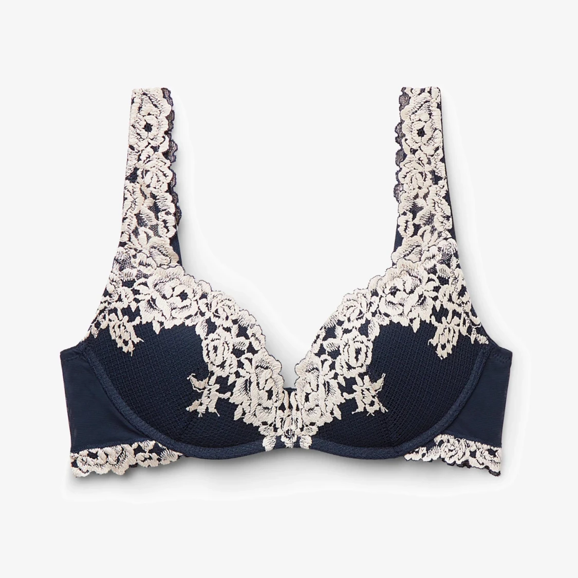 Snygg mörkblå bh från intimissimi med vacker blommig spets i vitt längs kupor och axelband. Ger en lyxig känsla och har en feminin design med fina spetskanter. Perfekt för dig som vill ha något extra under kläderna. Den är i storlek 75 C och har inga defekter alls💙 köptes nyligen!