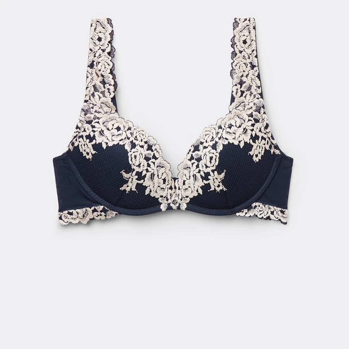Supersnygg mörkblå bh med krämvit spets och broderade blommor längs axelband och kupor. Bh:n har v-ringad form och är tillverkad i ett mjukt syntetmaterial som känns bekvämt mot huden. Perfekt för dig som gillar romantiska detaljer och vill sticka ut.