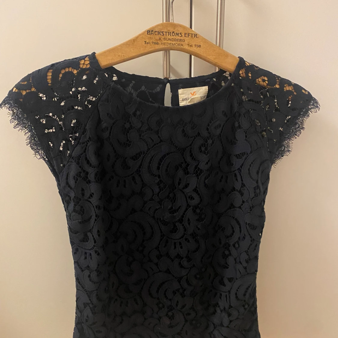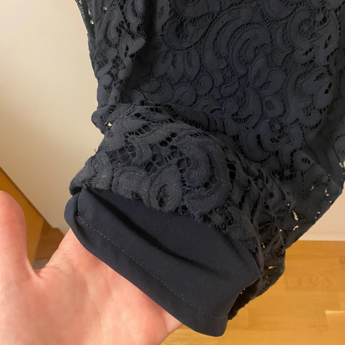 Supersnygg mörkblå blus från Kappahl med detaljerad spets och korta ärmar. Transparent spets vid axlarna. Har sytt om den från L till ca xs💕