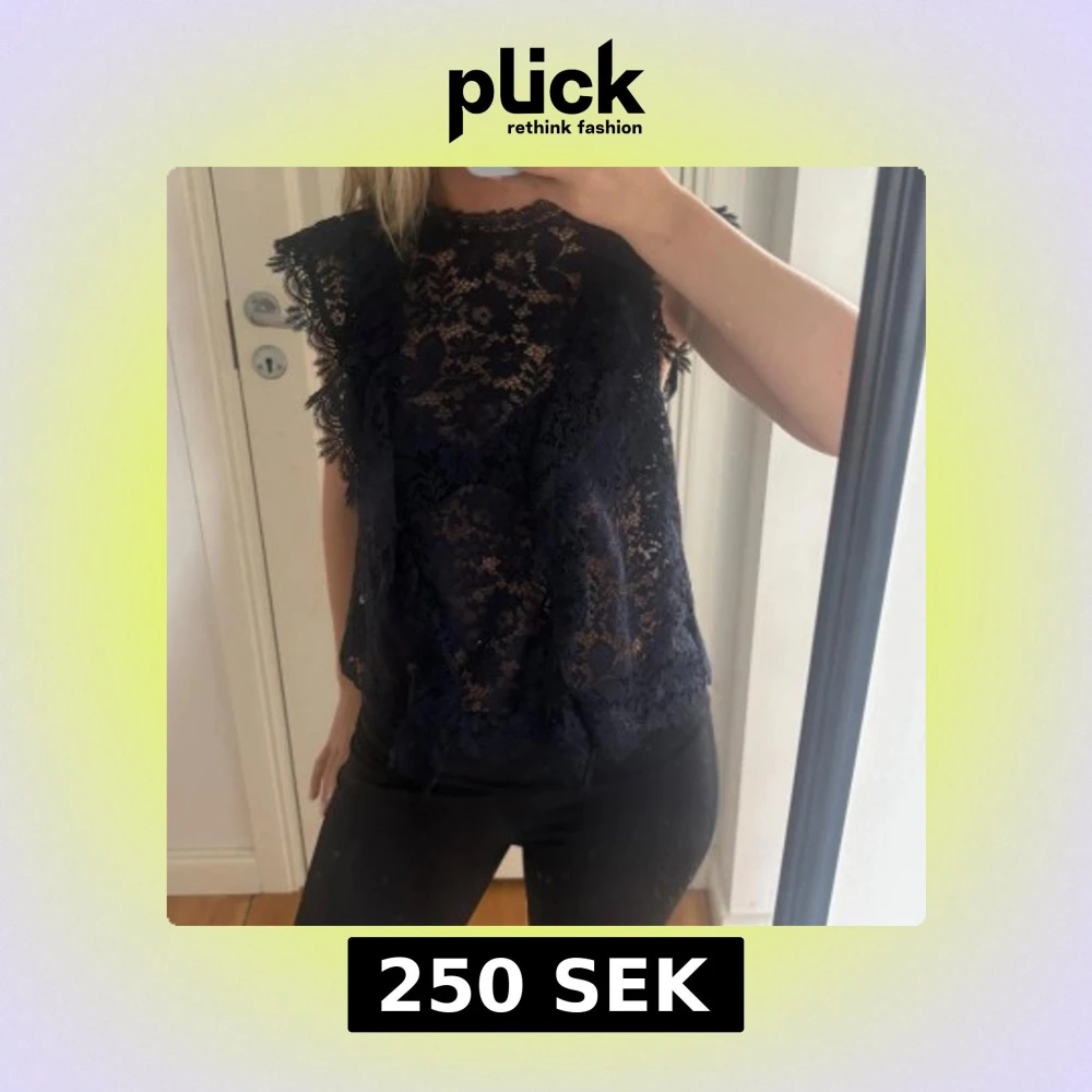 Supersnygg mörkblå blus från Zara i transparent spets med blommigt mönster. Blusen har ärmlös design med volangkant vid axlarna och rund hals. Använd fåtal gånger! Inga defekter