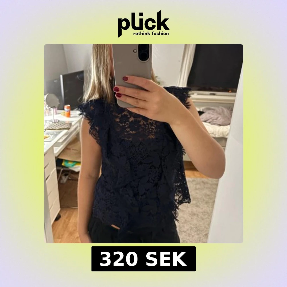 Supersnygg mörkblå blus från Zara i spets med volangdetaljer och ärmlös design. Blusen har ett feminint blommönster i spetsen och hög hals. Perfekt för dig som vill ha en elegant och trendig look.