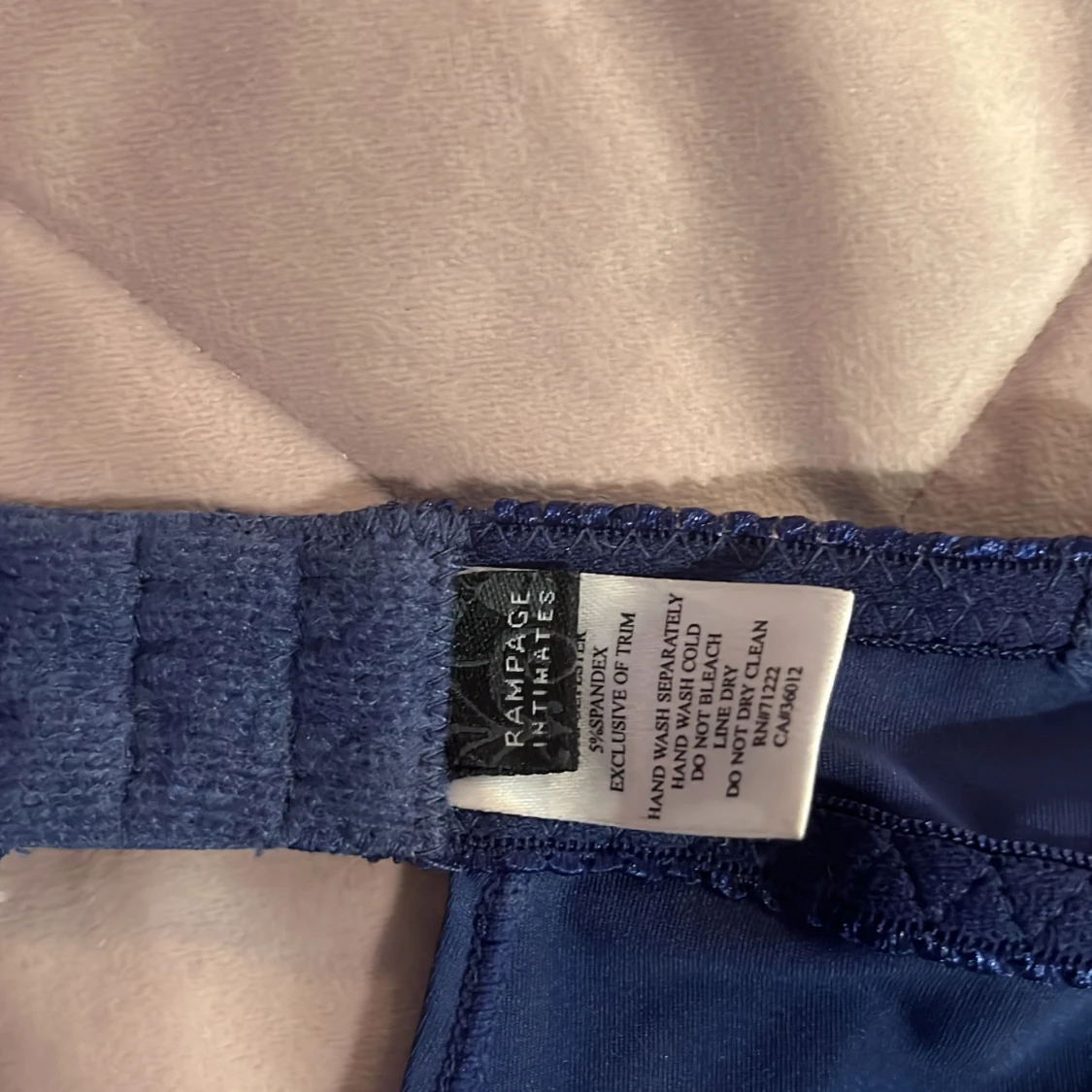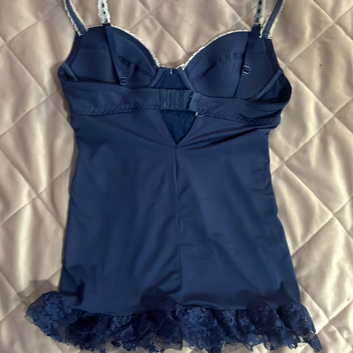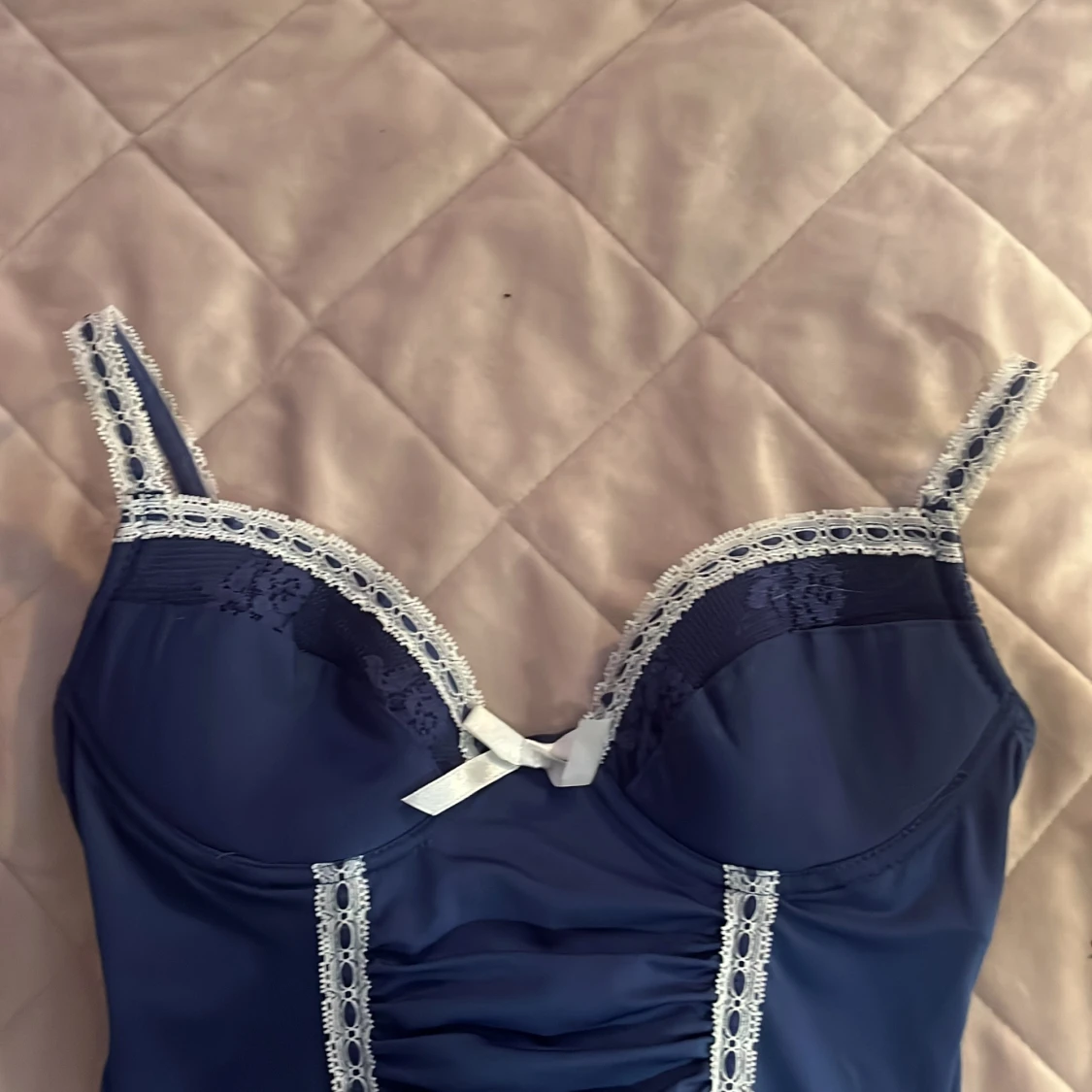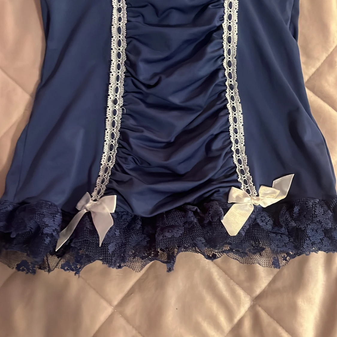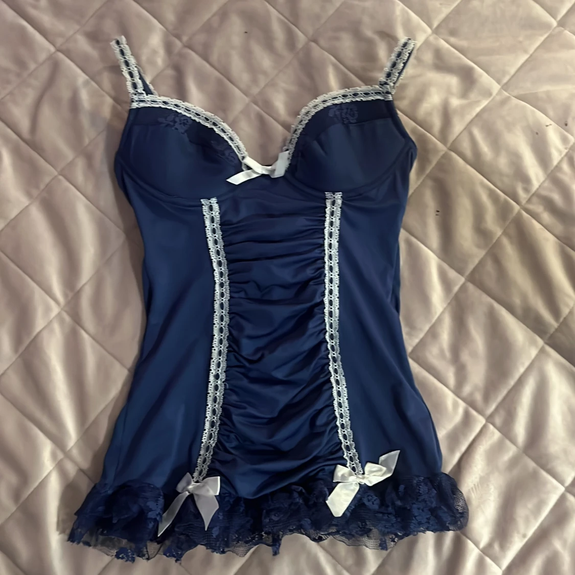 Säljer en mörkblå korsettopp från Rampage med vita spetsdetaljer och rosetter. Toppen har smala axelband, rynkade detaljer framtill och spetskant nertill. Perfekt för dig som vill ha något extra snyggt och unikt.