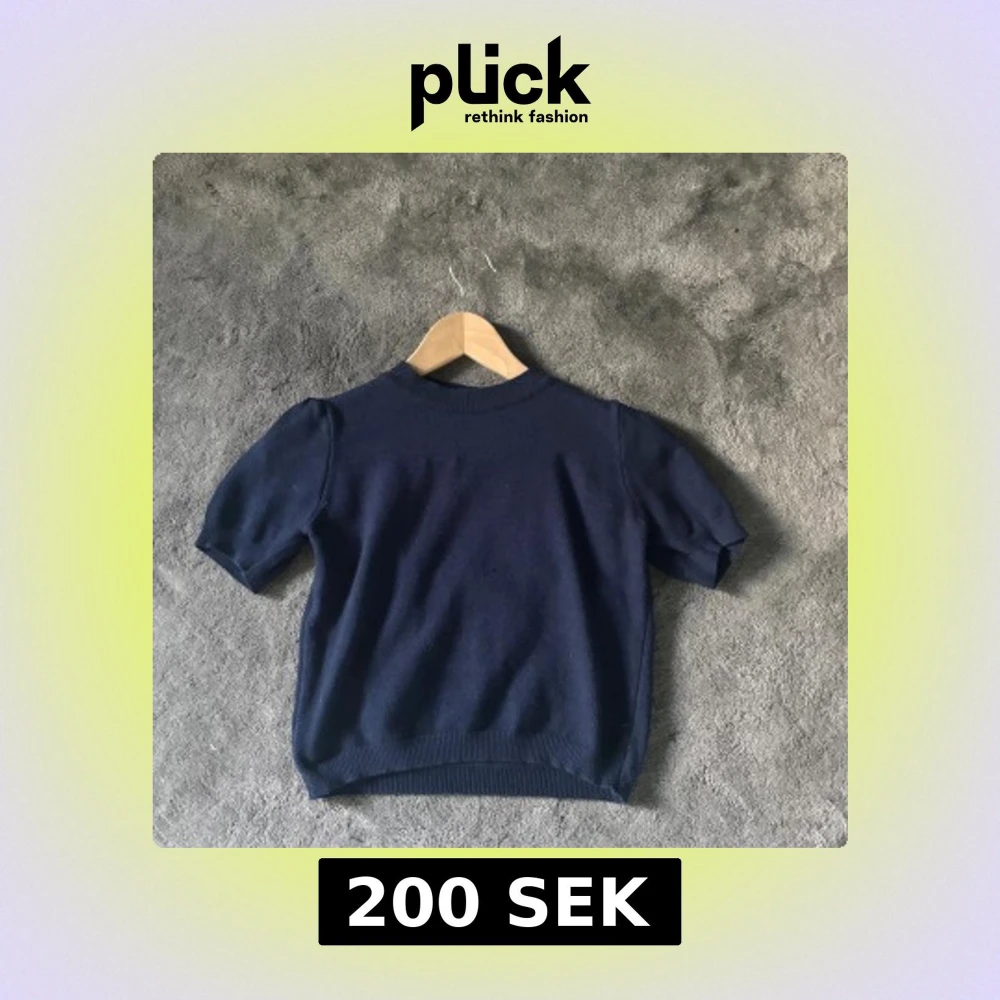 Mörkblå stickad topp från Meet Me There med korta puffärmar och ribbade kanter vid hals, ärmslut och nederkant.