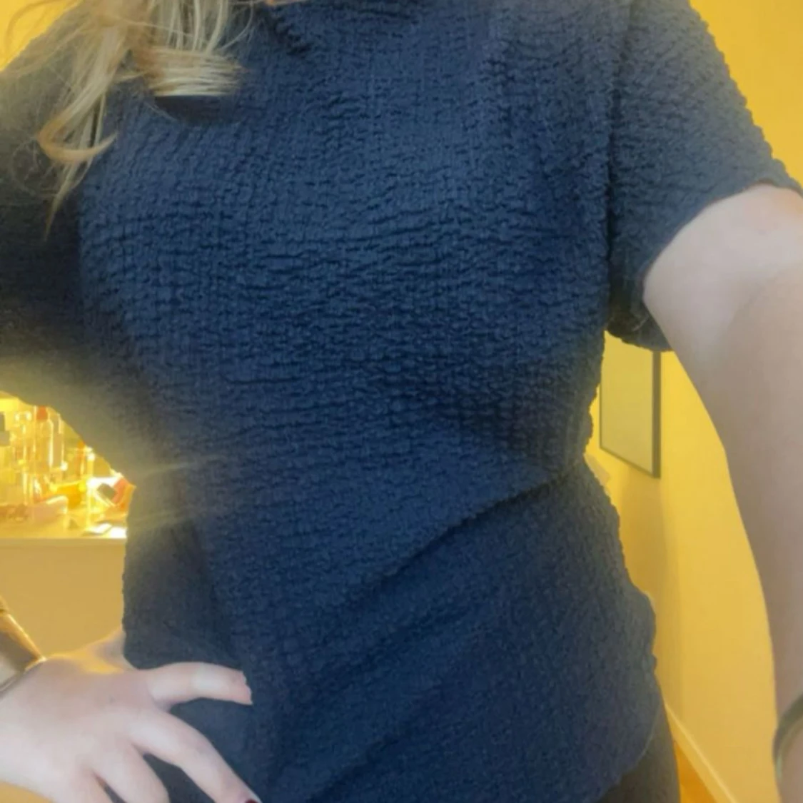 Säljer en mörkblå topp med kort ärm och coolt strukturerat tyg. Toppen har en enkel, rak passform och är perfekt för dig som gillar stilrena plagg med lite extra textur. Passar till både jeans och kjol💙