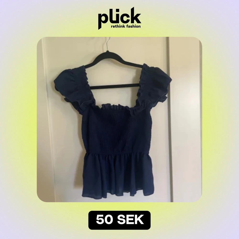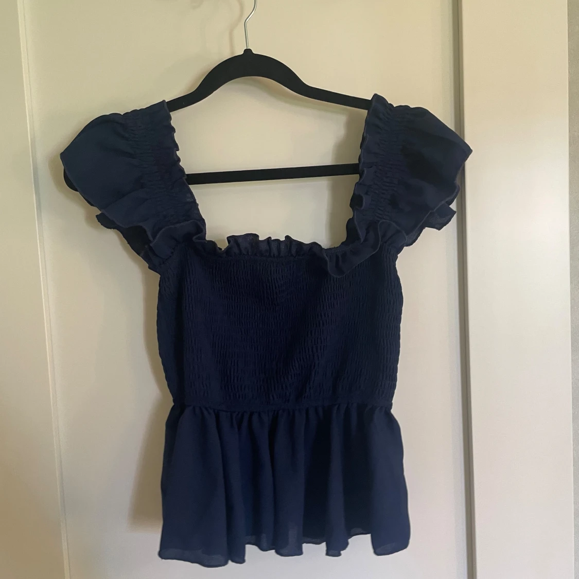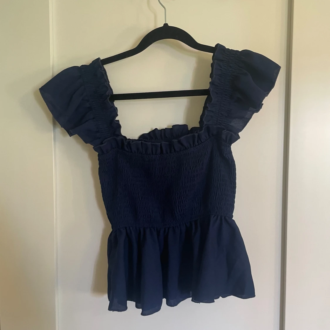 Säljer en söt mörkblå topp med volangärmar. Toppen har en smockad överdel som ger en tight passform och en volangkant nedtill som ger en fin detalj. Perfekt för sommaren och festliga tillfällen!
