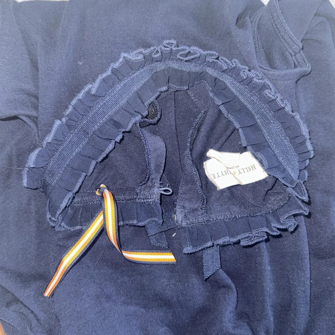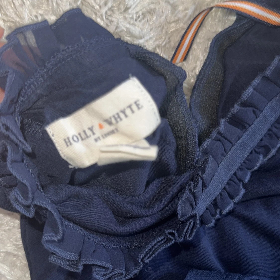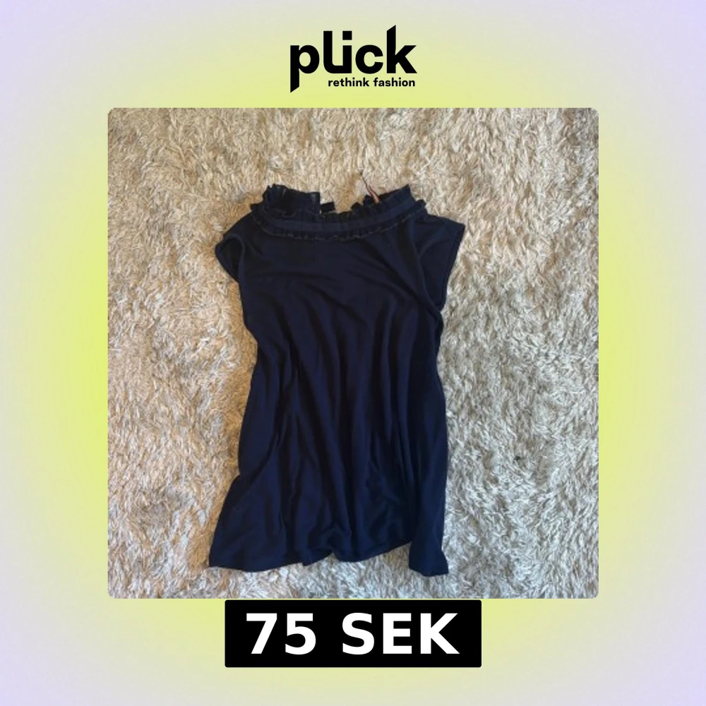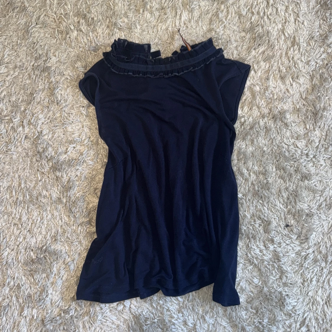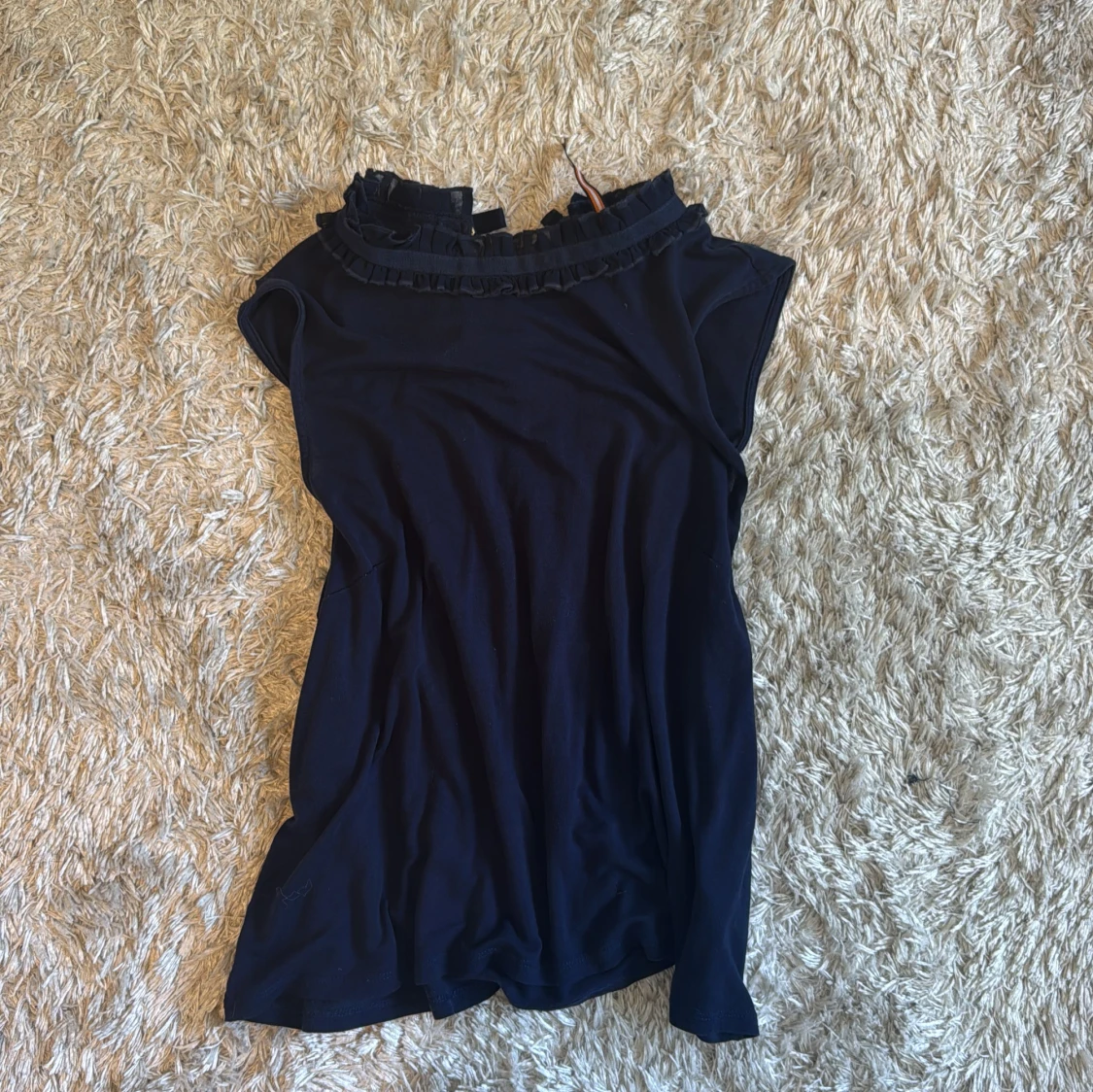 Säljer en mörkblå topp från Holly & White med volangdetaljer runt kragen. Toppen är ärmlös och har en elegant, enkel design som passar perfekt till sommaren. Materialet känns mjukt och lätt, och modellen är normal i passformen.