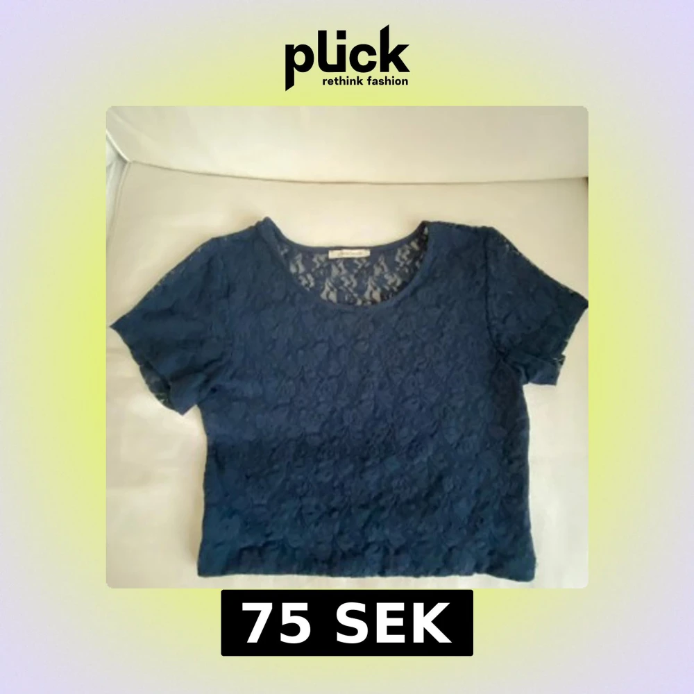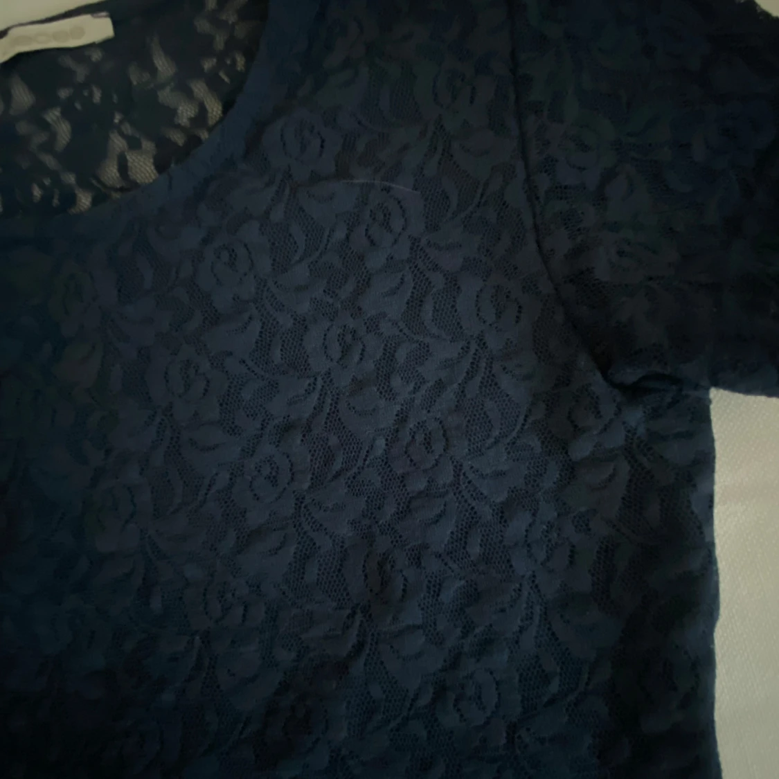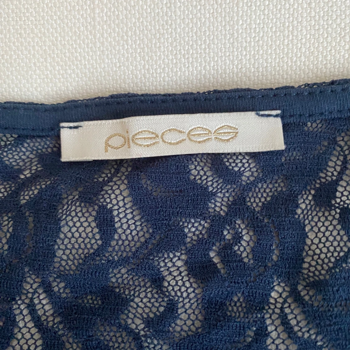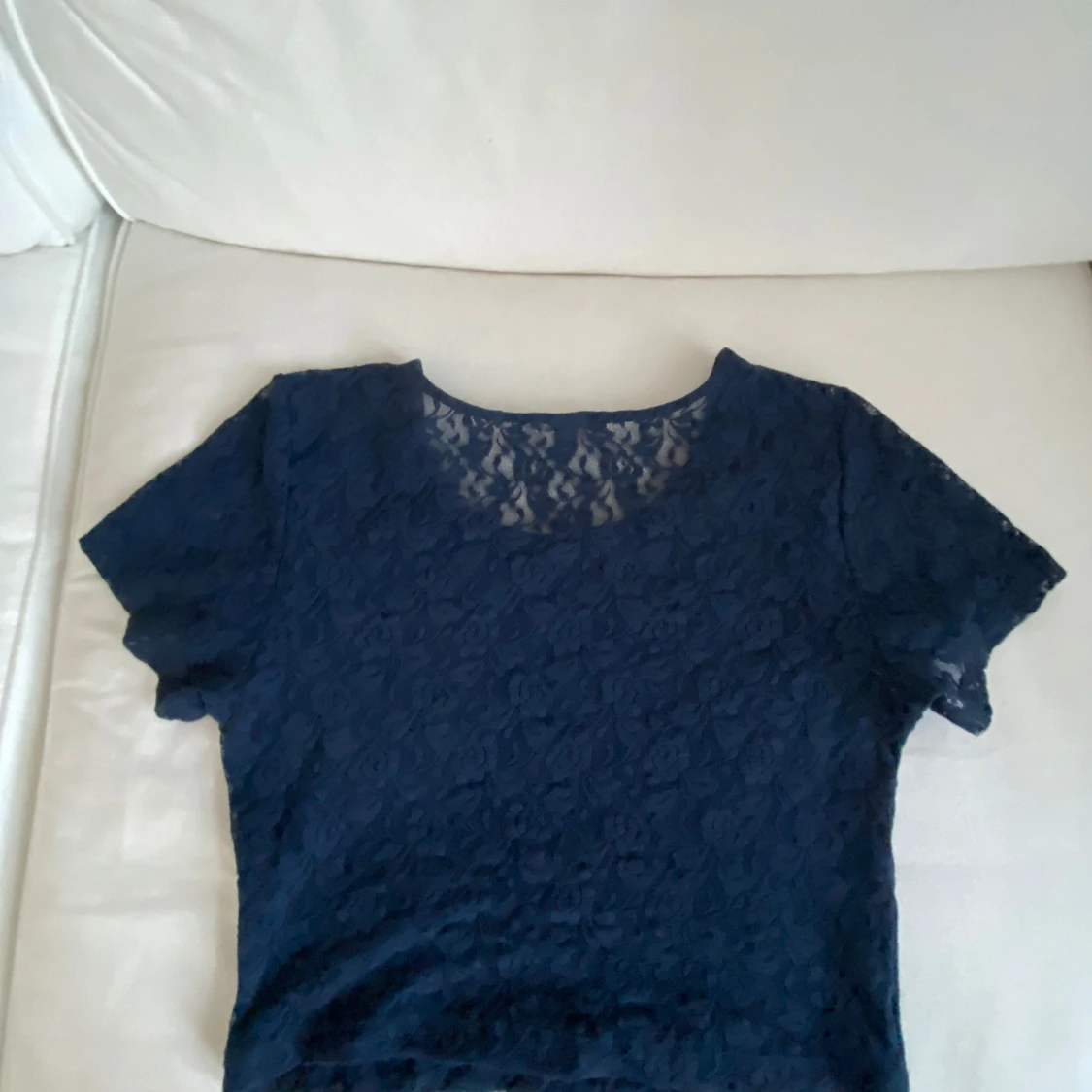 Säljer en mörkblå, croppad blus från Pieces med korta ärmar. Toppen är helt täckt av blommig spets och har rund halsringning.