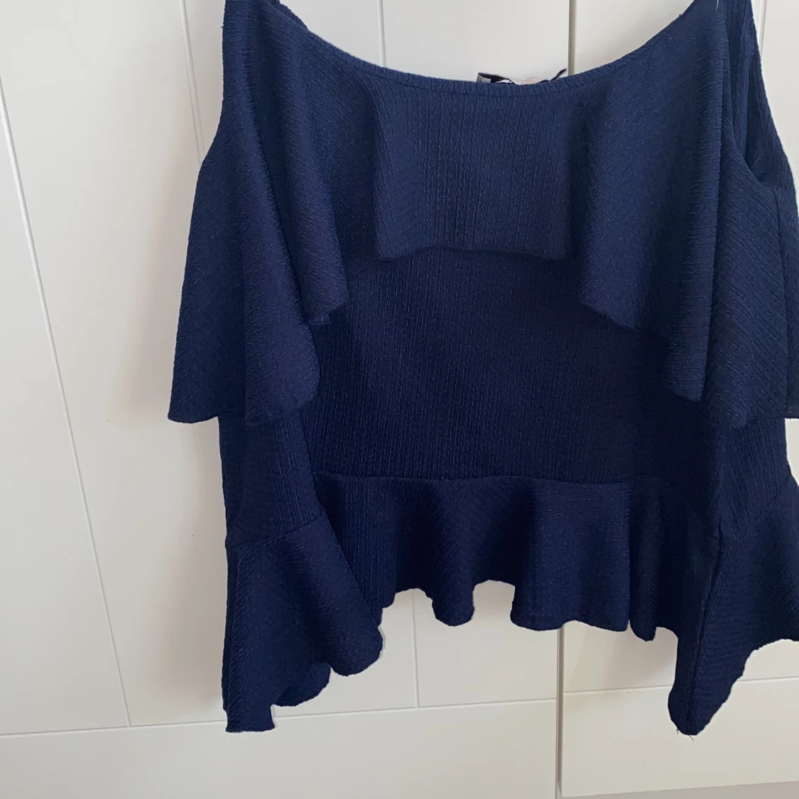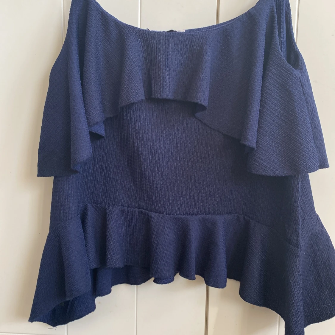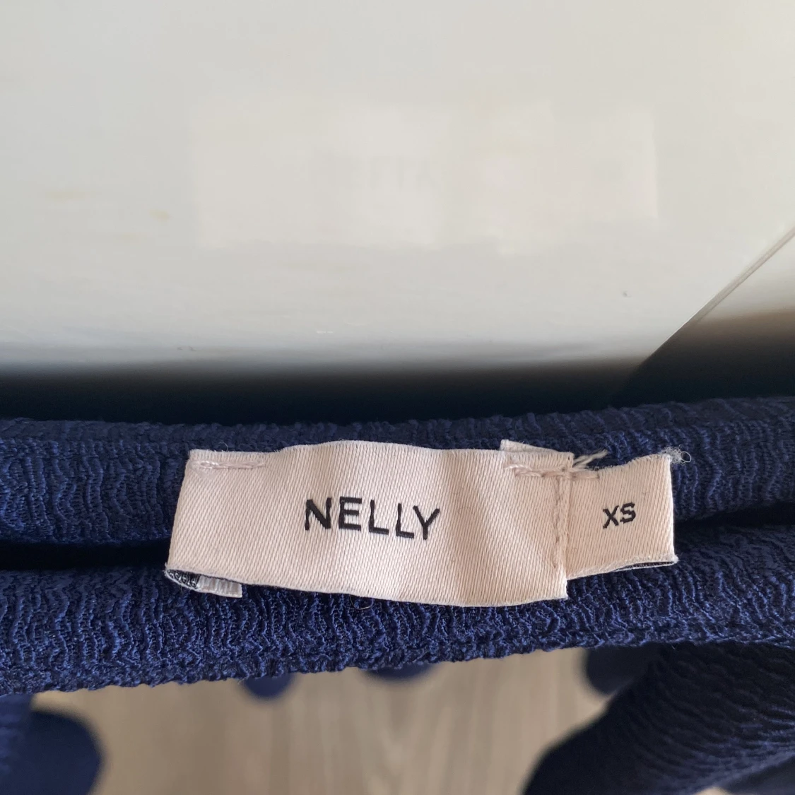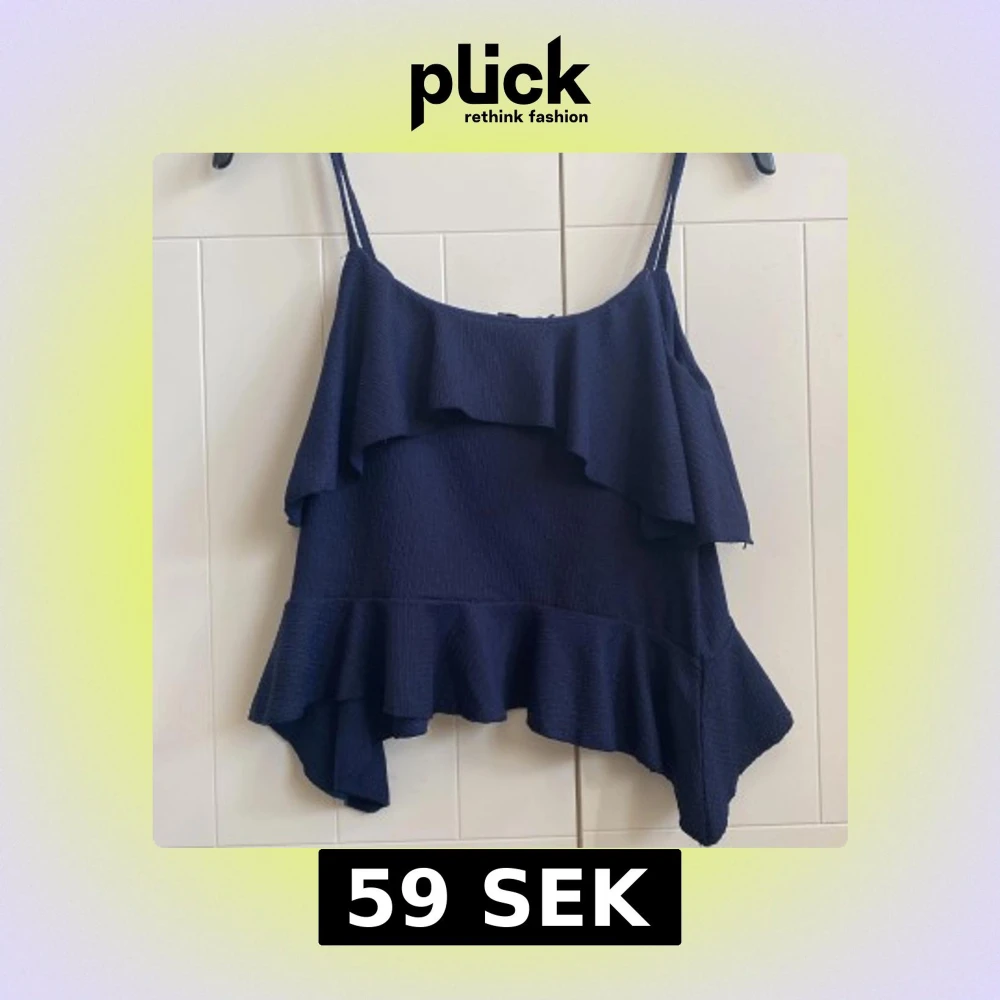 Säljer en mörkblå linnetopp från Nelly i storlek XS. Toppen har tunna axelband, volangdetaljer både upptill och nedtill samt en lätt ribbad struktur i tyget. Asymmetrisk nederkant ger en cool och unik look. Perfekt för dig som gillar trendiga och feminina plagg.