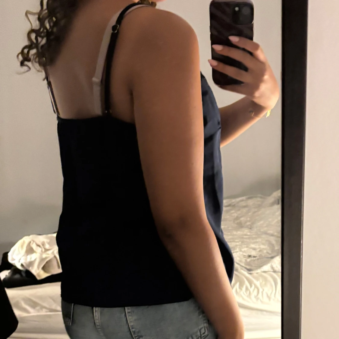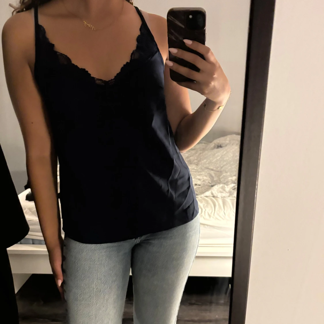 Snyggt mörkblått linne från Shein med spetsdetaljer vid axelbanden. Perfekt för en stilren look. Linnet har en enkel design med smala axelband och en mjuk, flytande passform.