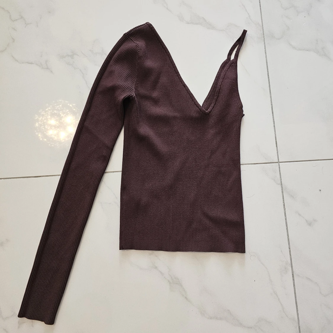 Snygg mörkbrun långärmad topp med ribbad struktur och djup v-ringning. Modellen är slim och sitter tajt mot kroppen, perfekt för att skapa en clean och stilren look. Materialet är mjukt och stretchigt, vilket gör den bekväm att bära hela dagen.