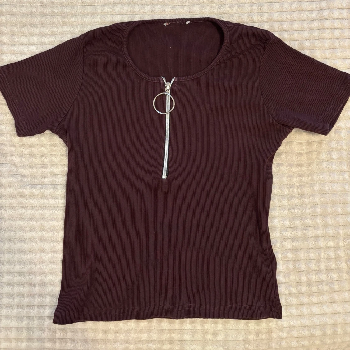 Snygg mörkbrun ribbad topp med korta ärmar och rund halsringning. Inga skador. Storlek xs