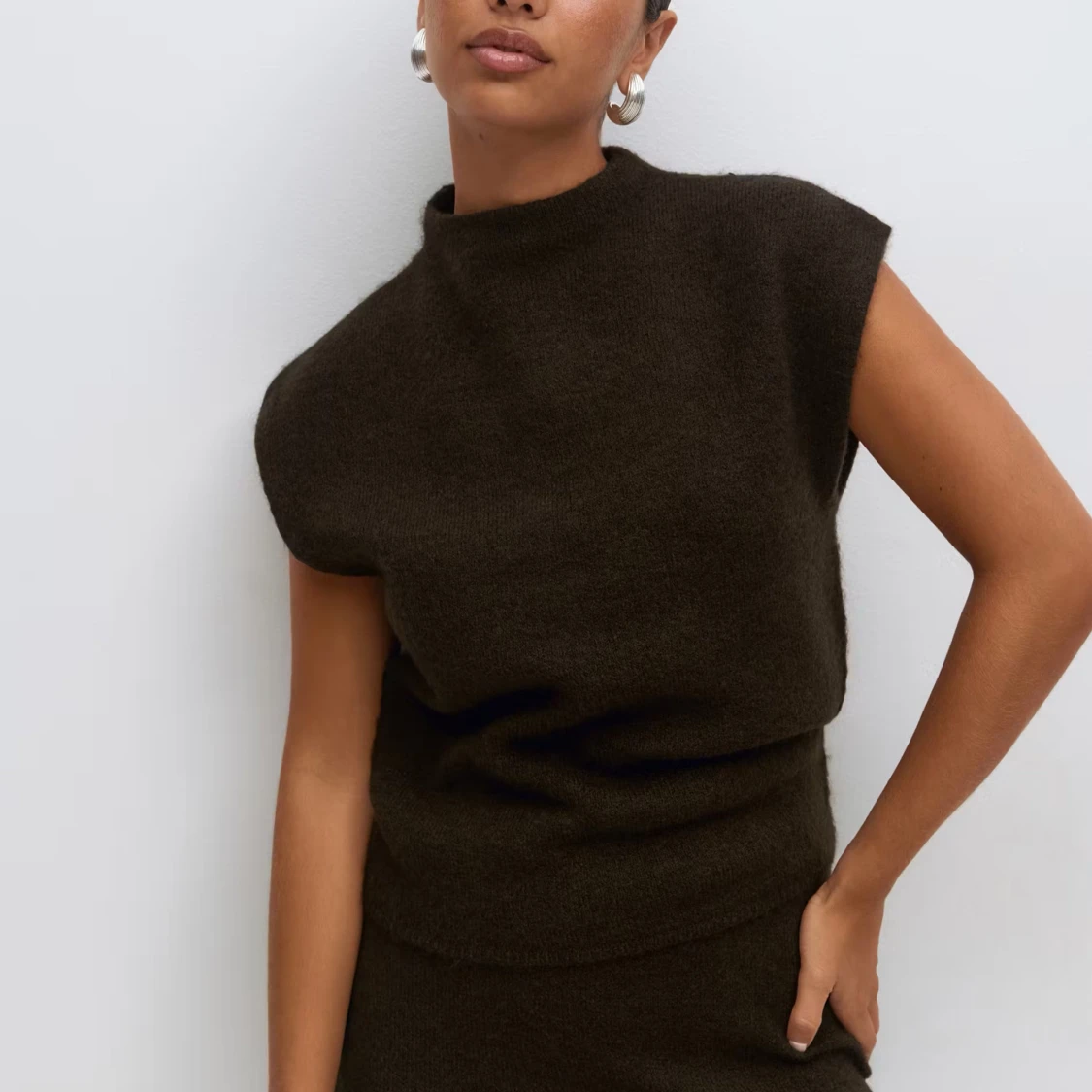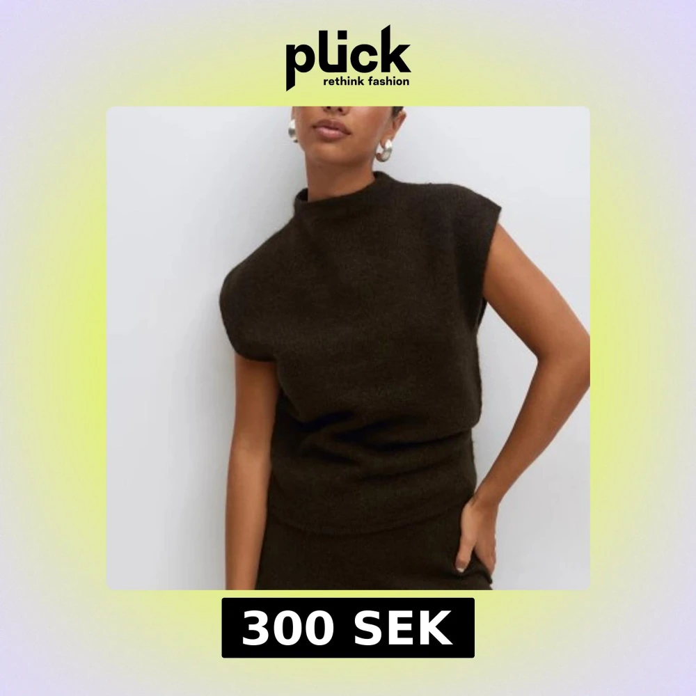 Helt oanvänd, fortfarande i sin förpackning.Säljer en mörkbrun stickad topp med hög hals och ärmlös design. Toppen har en mjuk och lite lös passform som ger en avslappnad men stilren look. Perfekt att matcha med kjol eller jeans för en trendig outfit.