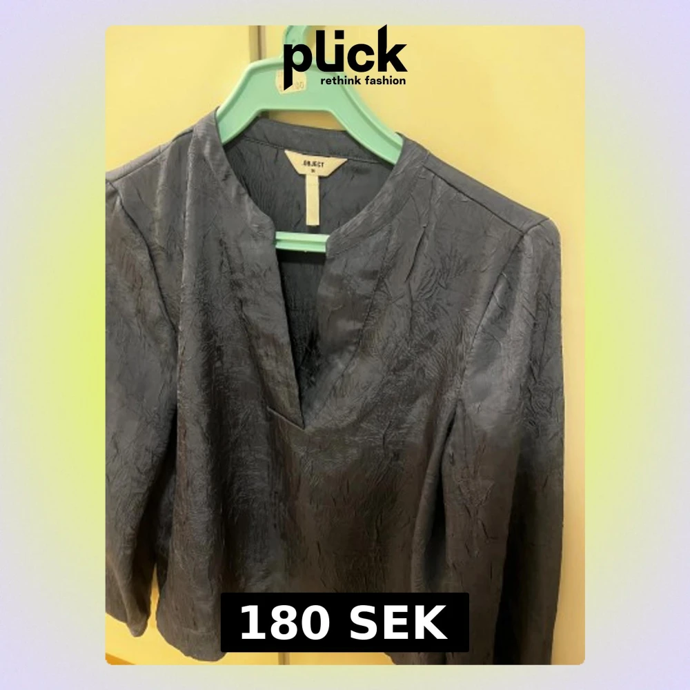 Säljer en mörkgrå blus från Object med snyggt skrynklat tyg och v-ringad hals. Blusen har långa ärmar och en rak, något lös passform. Perfekt för dig som gillar stilrena plagg med en twist.