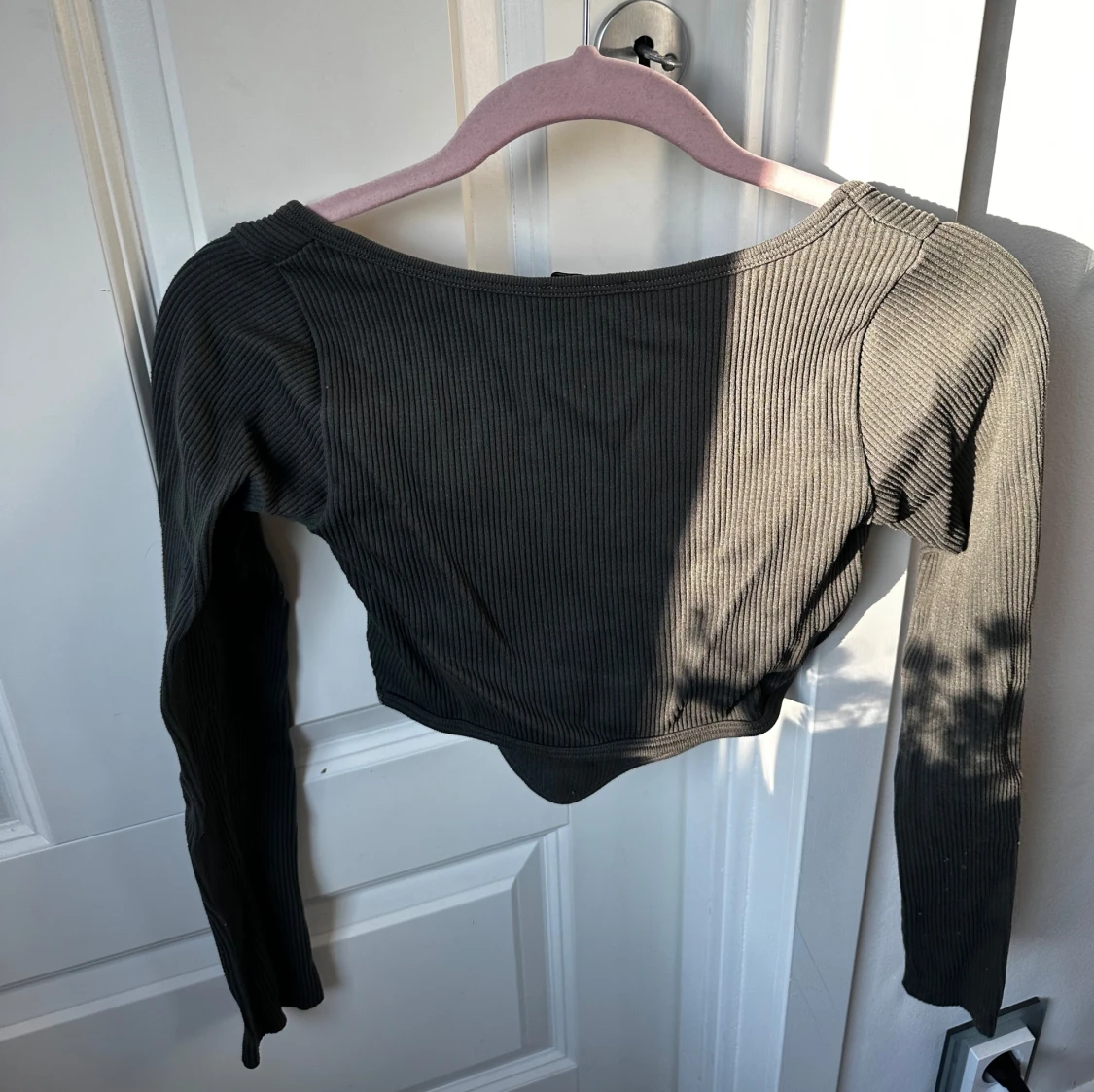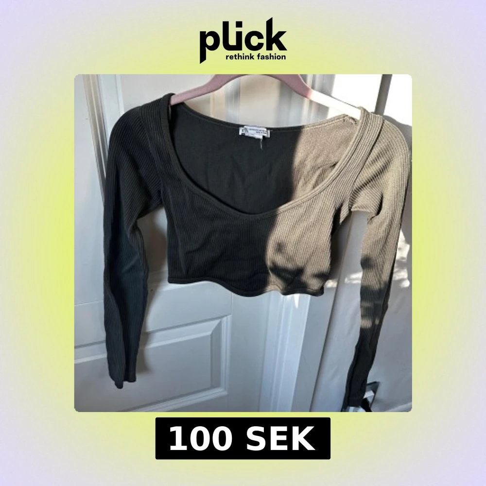 Säljer en mörkgrå croppad topp från Zara med lång ärm och djup v-ringning. Toppen är ribbad och har en tight passform, perfekt att styla med höga jeans eller kjol. Köpte här på Plick men säljer nu då den har blivit för liten! ❤️