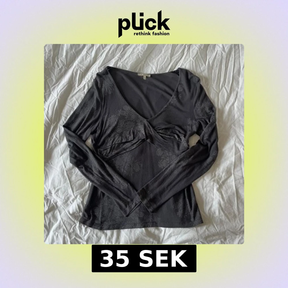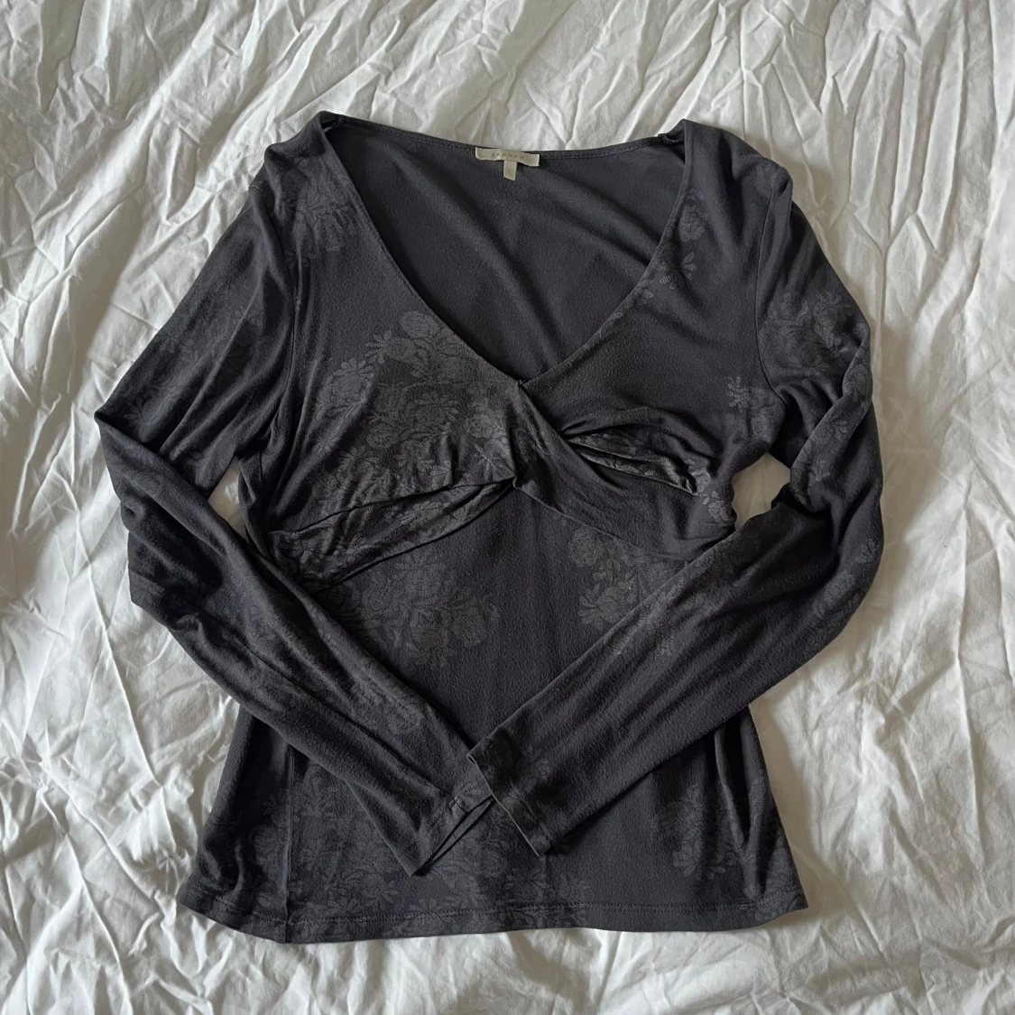 Mörkgrå topp med långa ärmar och v-ringning. Storlek L men passar S-L beroende på hur man vill att den ska sitta.