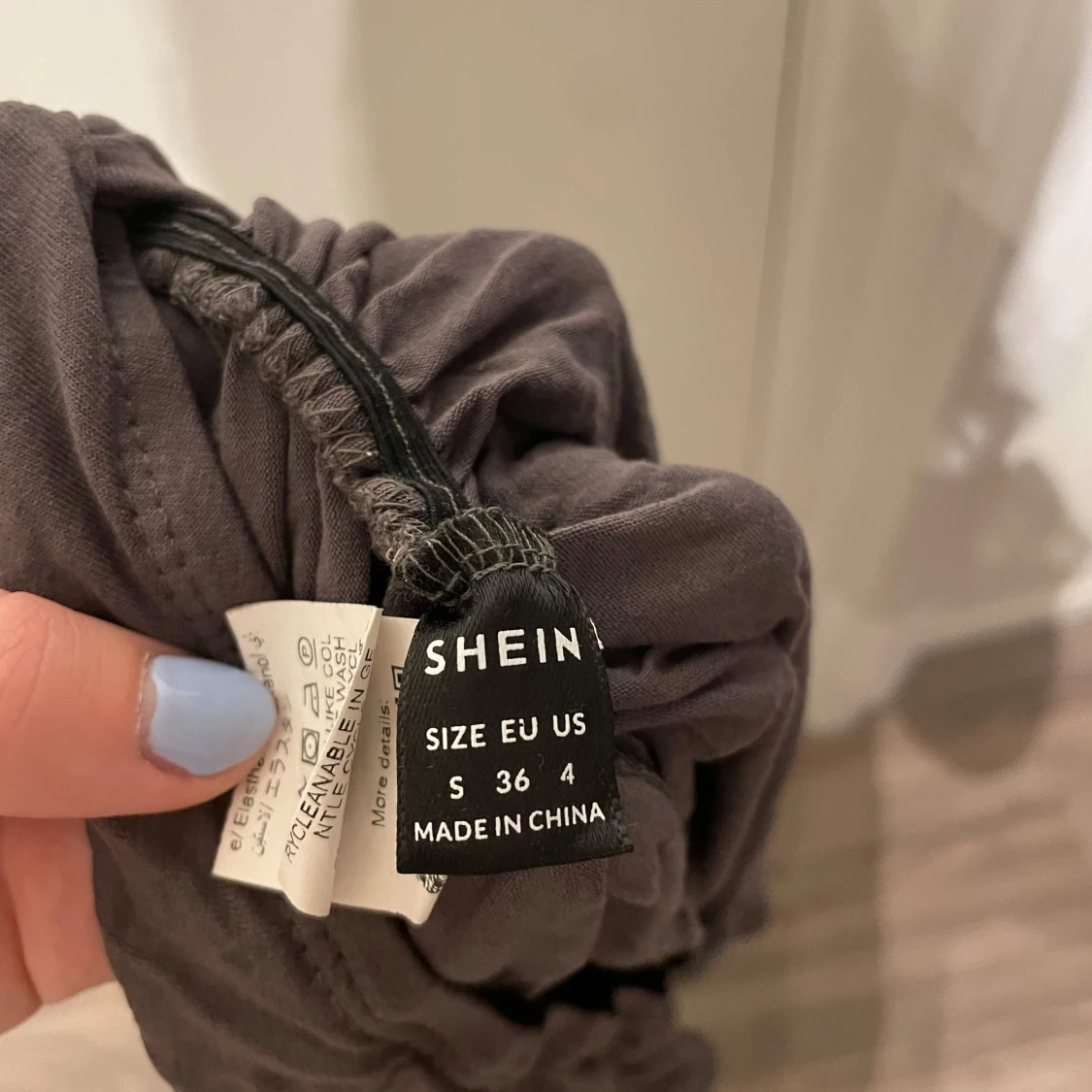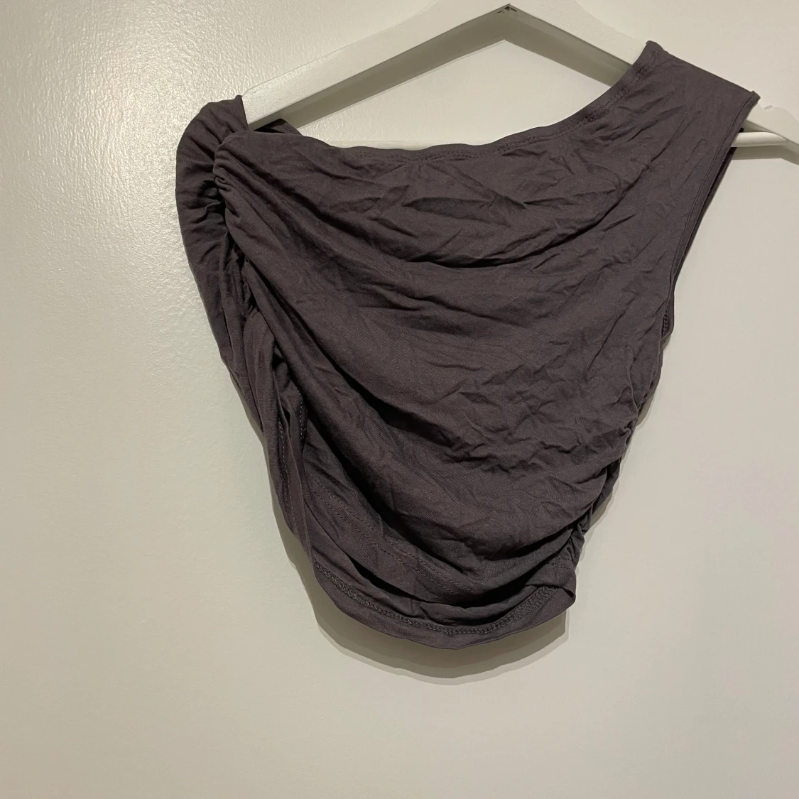 Säljer en mörkgrå oneshoulder topp från SHEIN i storlek S. Toppen har draperad design och är ärmlös på ena sidan, vilket ger en cool och trendig look. Perfekt för dig som gillar att sticka ut med asymmetriska plagg.