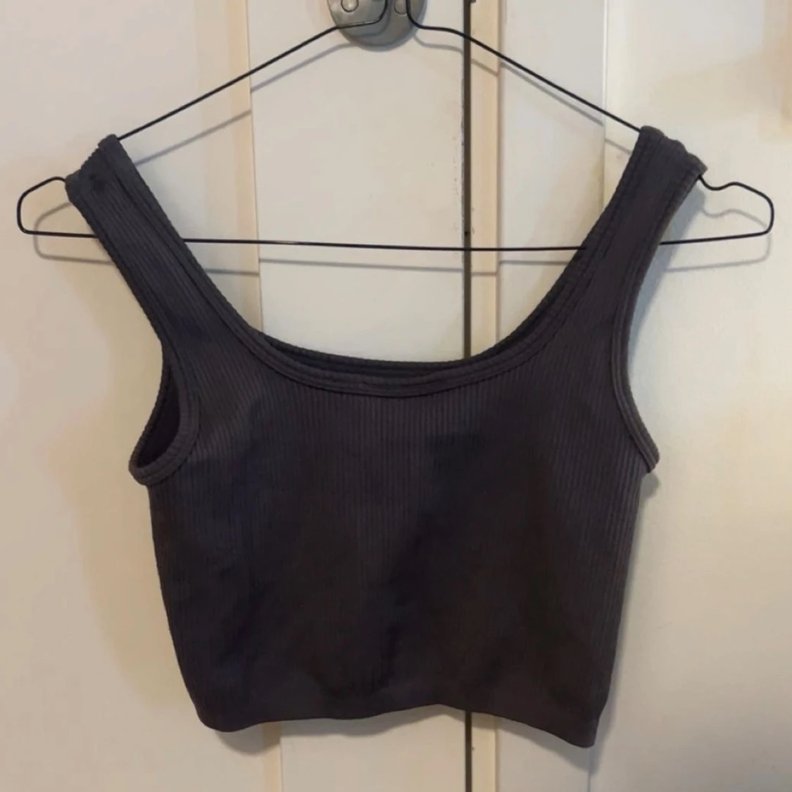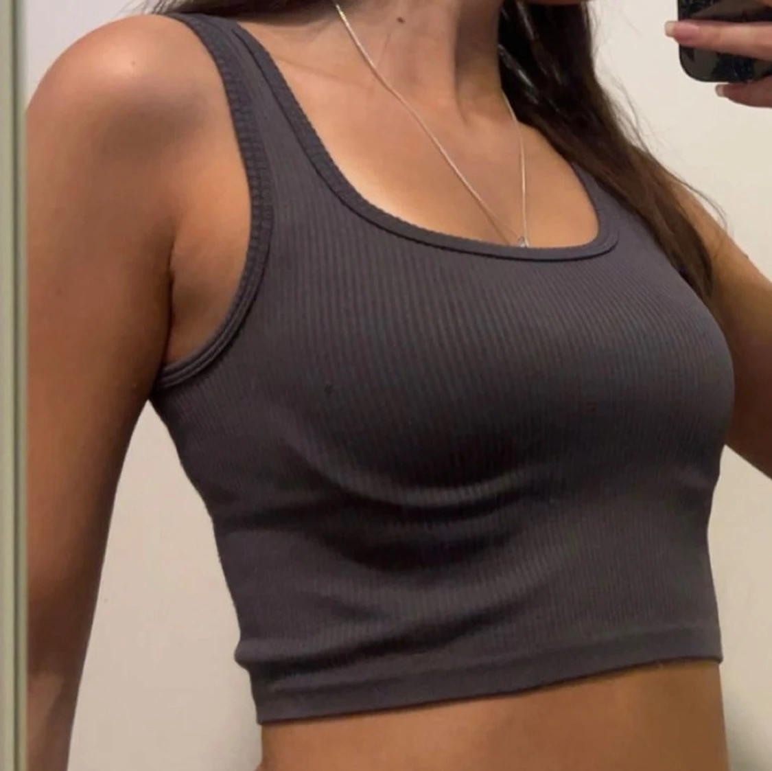 Snygg mörkgrå croppad linnetopp med ribbad struktur och breda axelband. Storlek XS