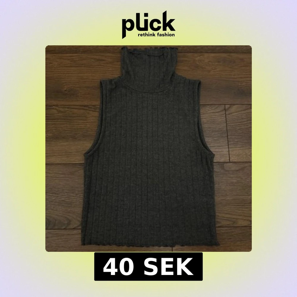 Säljer en mörkgrå ärmlös polotopp med ribbad struktur och hög krage. Toppen har en mjuk och stretchig känsla, perfekt för att styla lager på lager. Avslutet nertill har en lätt vågig kant för extra detalj.