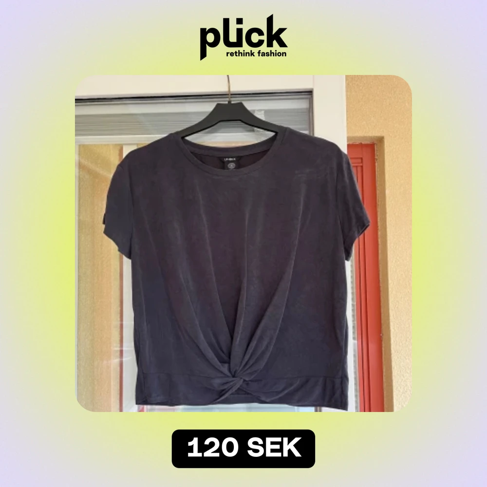 Säljer en mörkgrå topp från Lindex i storlek XS. Den är gjord av en mjuk blandning av modal och polyester med lite elastan för stretch. Toppen har korta ärmar och en knytdetalj framtill som ger den en unik look. Sustainable Choice.