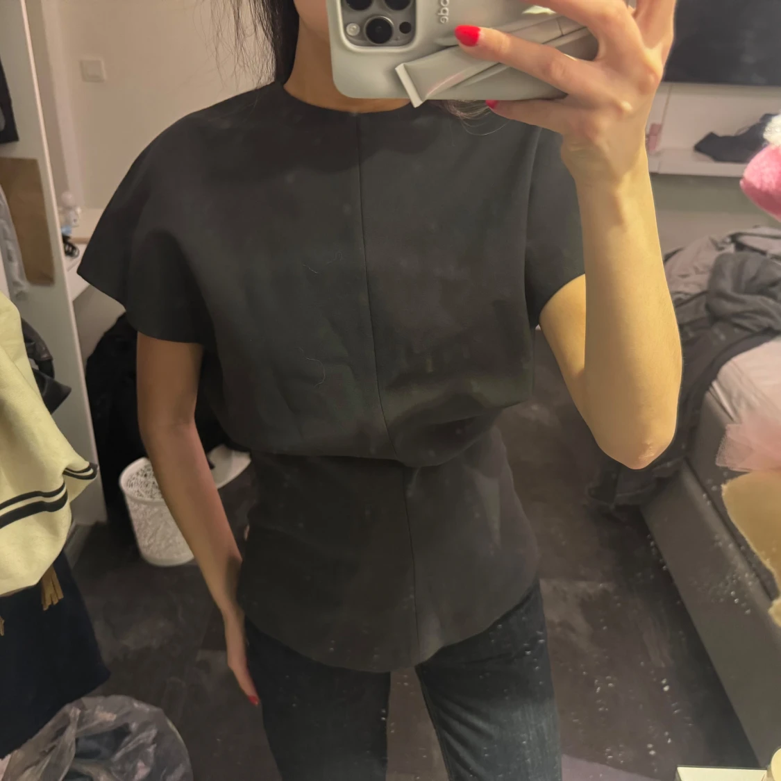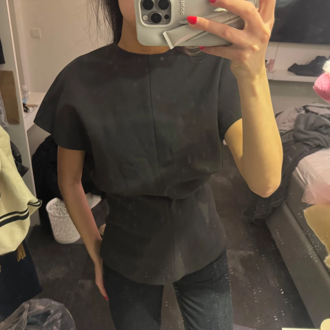 Säljer en stilren mörkgrå topp med korta ärmar. Toppen har en elegant och enkel design som passar perfekt till olika tillfällen. Den är figursydd för en smickrande passform. Ny med prislapp