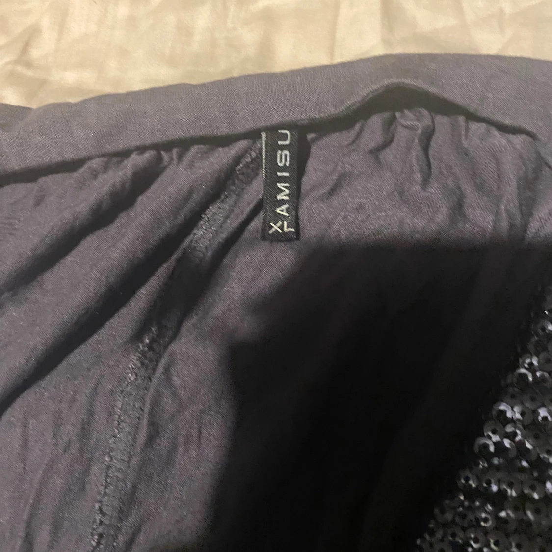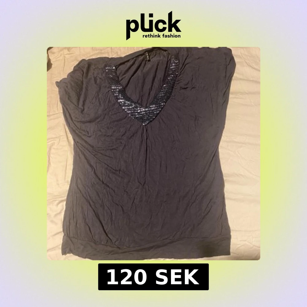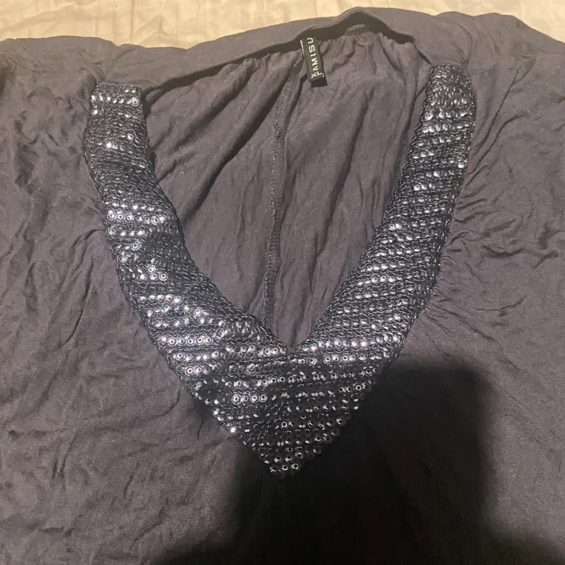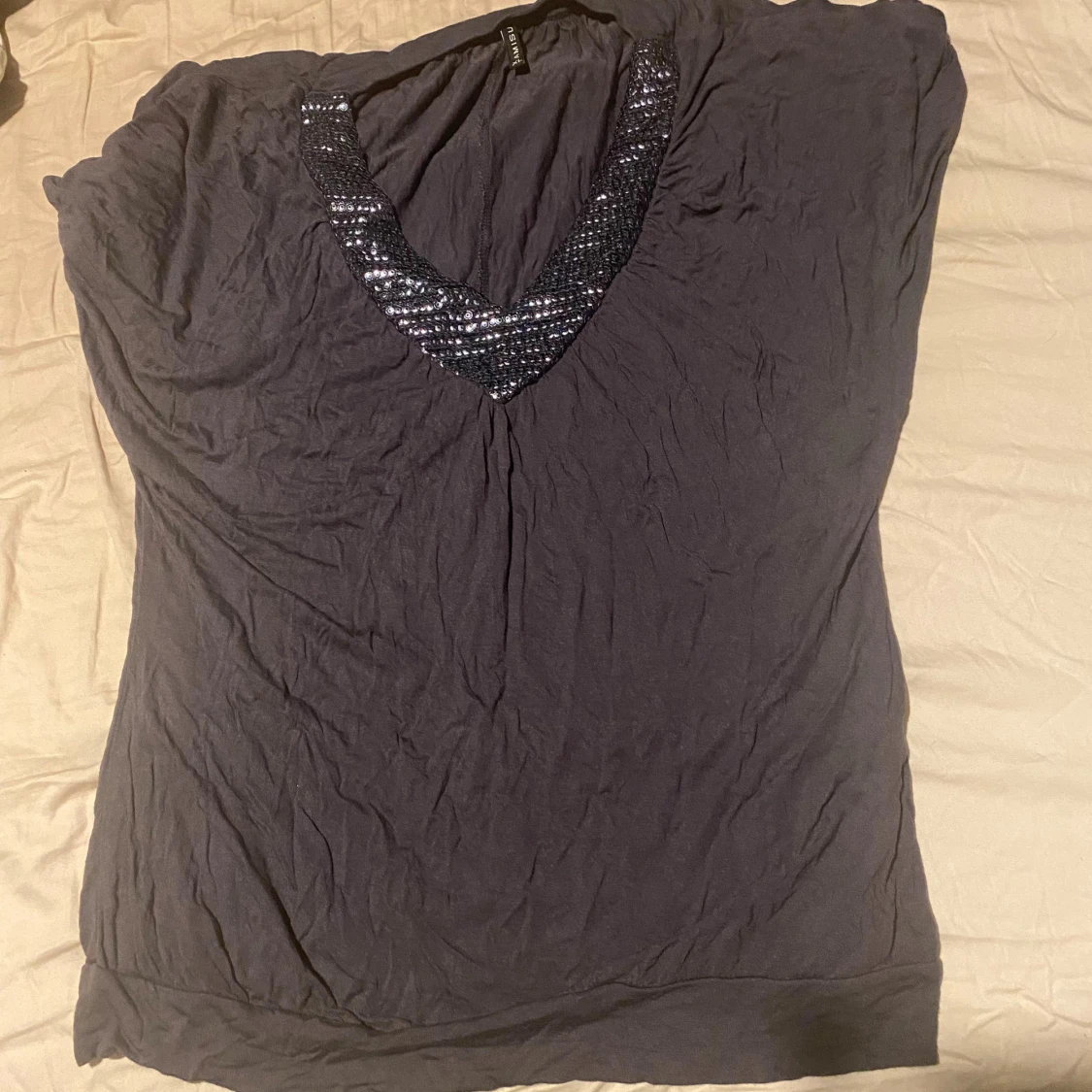 Snygg mörkgrå topp från Amisu med djup v-ringning dekorerad med glittriga paljetter. Toppens material är mjukt och lätt, perfekt för dig som gillar lite extra bling. Modellen är ärmlös och har en avslappnad passform som sitter skönt.