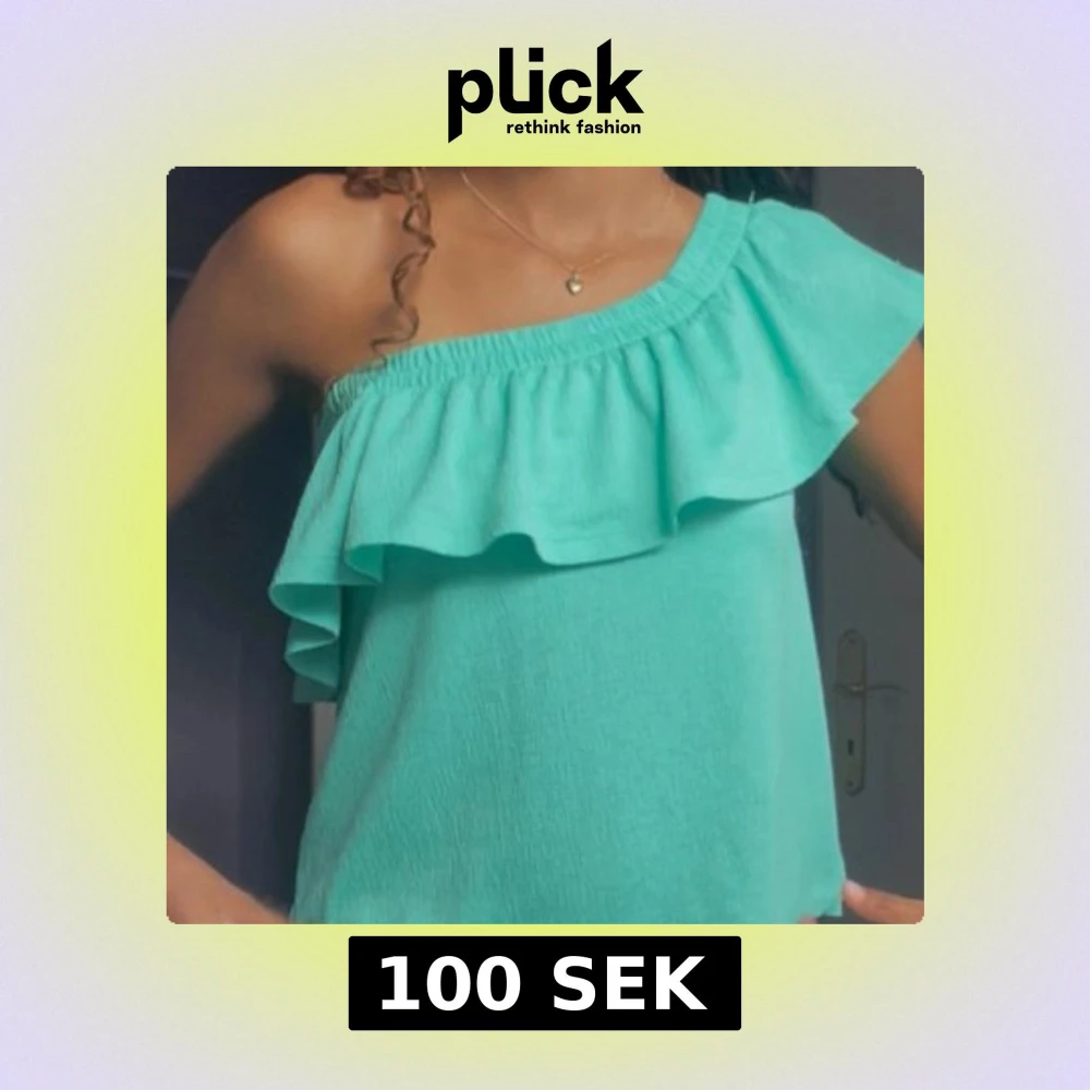 Säljer en turkos ärmlös topp med bred volang längs halsringningen. Toppen har en offshoulder-look och är tillverkad i ett lätt, strukturerat tyg som känns luftigt och fräscht. Perfekt för varma dagar och ger en trendig vibe.