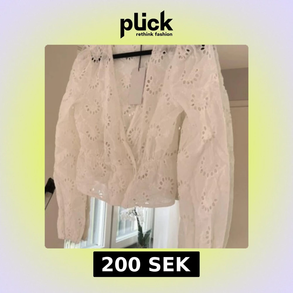Superfin vit blus med v-ringning och anglaise mönster. Långa ärmar med lätt puff. Blusen har omlottkänsla och är helt ny med prislapp