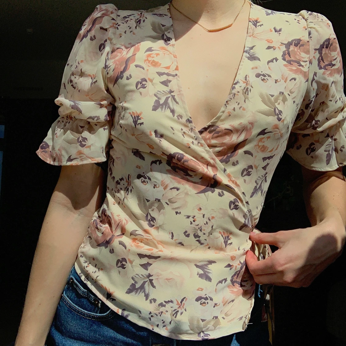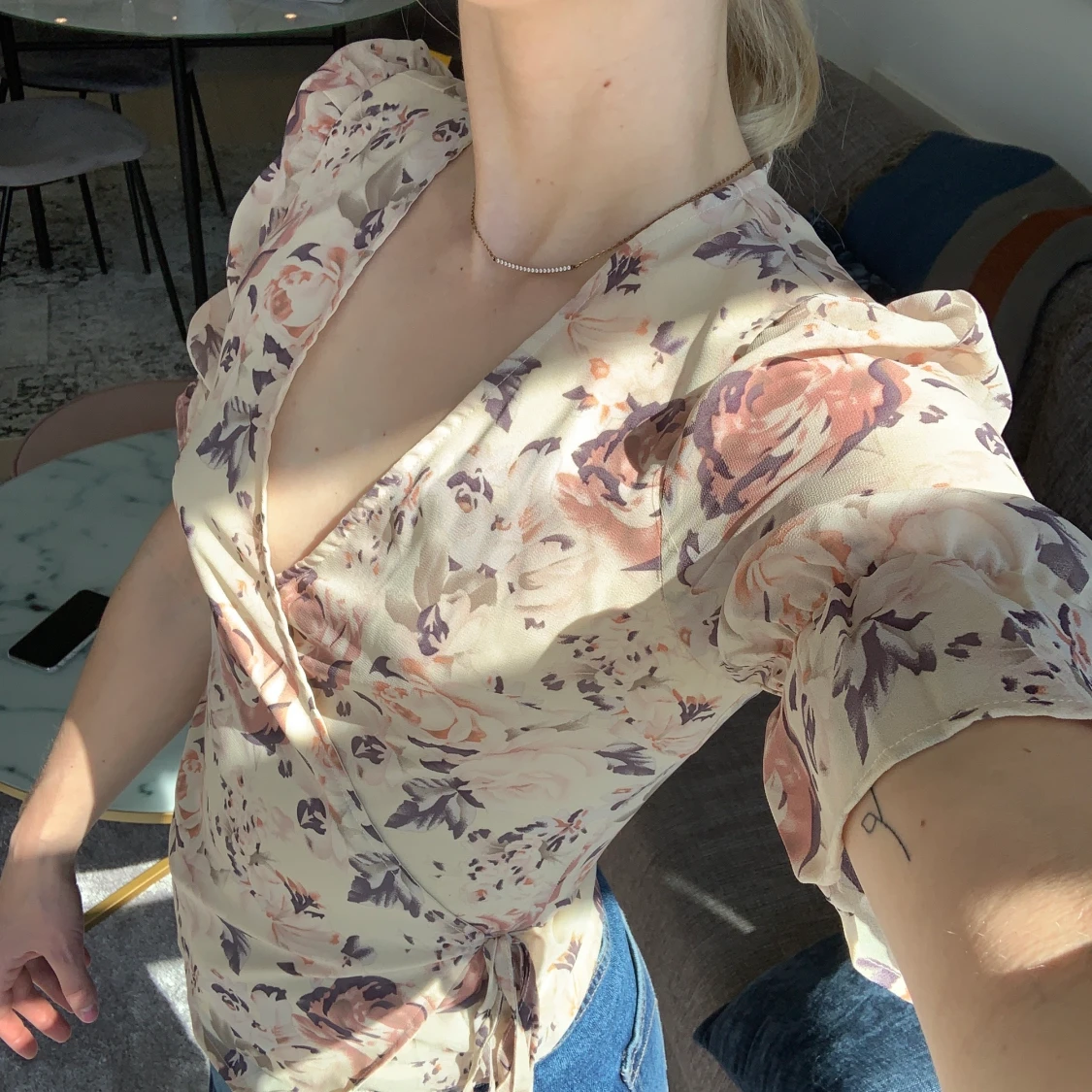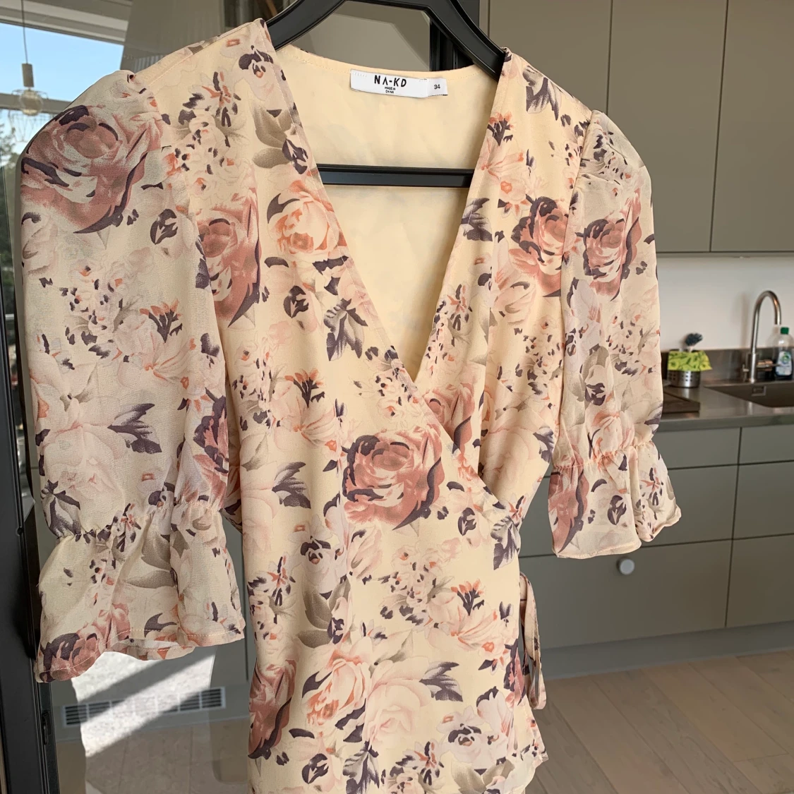En helt ny blus med blomprint från NA-KD i storlek XS. Aldrig använd. Säljes pga för stor i bysten (jag har A/B kupa). Superfint print med blommönster på beiget silkestyg.