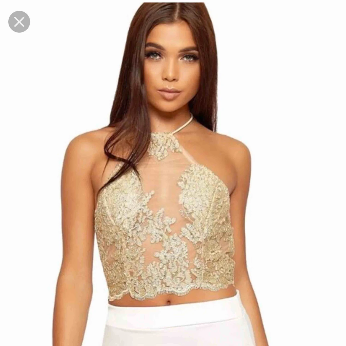 Så snygg halterneck topp i guldfärg och mesh. Knyte runt halsen. Jättesnygg men passar inte mig tyvärr. Frakt tillkommer 30kr.