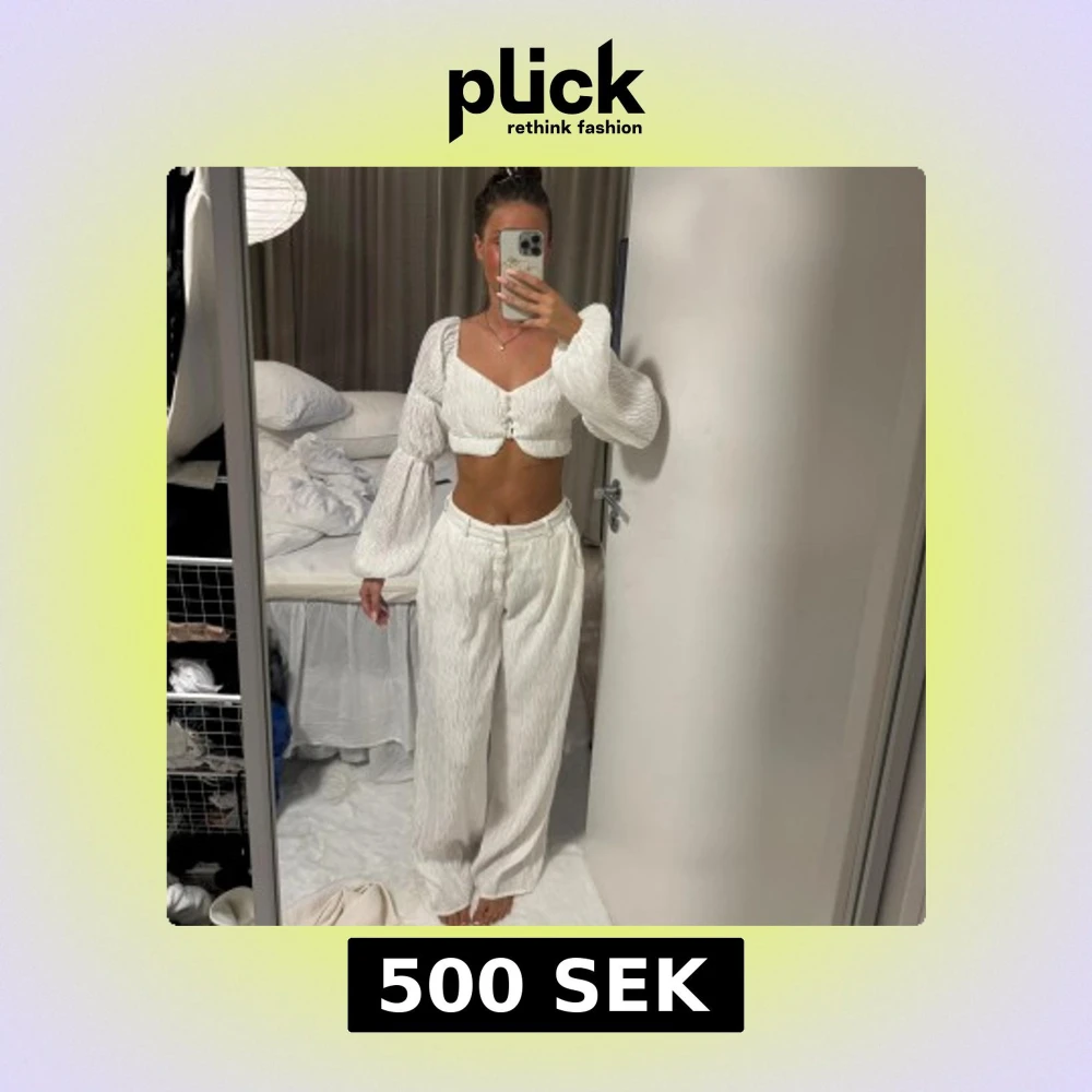 Vit croppad blus med puffärmar och matchande byxor