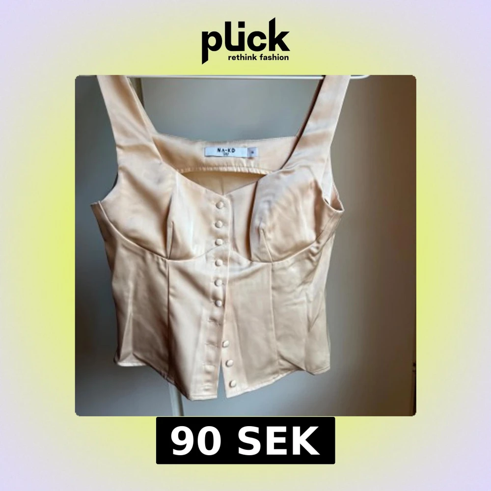 Supersnygg champagnefärgad korsett från NA-KD i glansig satin. Toppen har breda axelband, markerade kupor och dekorativa knappar framtill. Figurnära passform som ger en riktigt trendig siluett. Perfekt att styla med jeans eller kjol för en chic look. Helt ny utan prislapp.