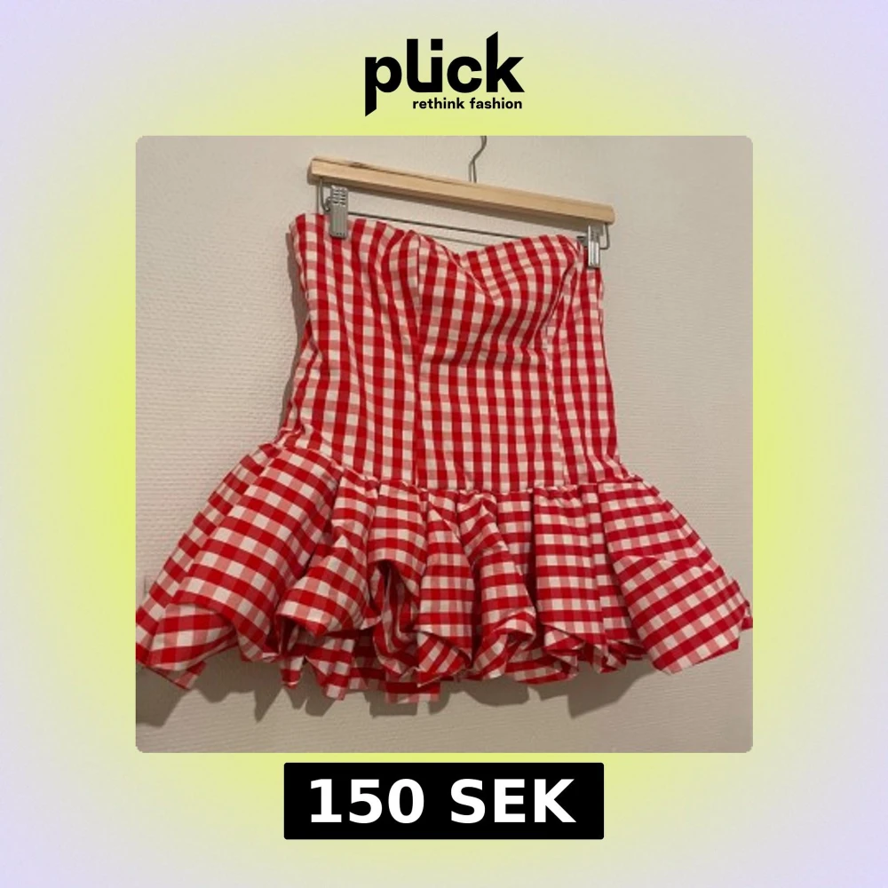 Superfin rutig topp från NA-KD i rött och vitt. Strapless modell med volang nedtill. Toppen har en figurnära passform upptill och en fluffig kjol. Köpt för lite mer än ett år sedan, endast använd 1 gång.